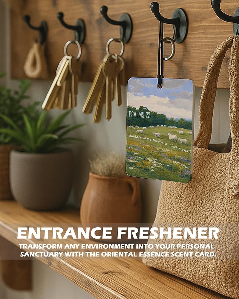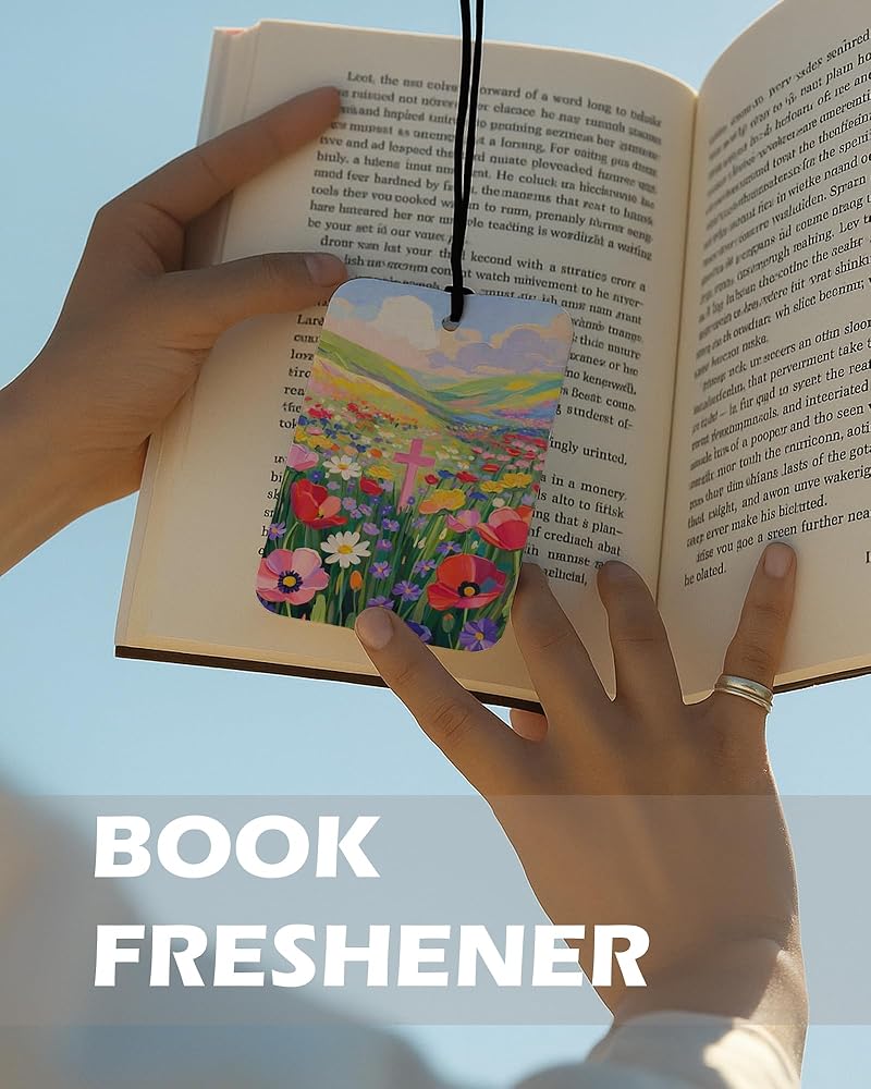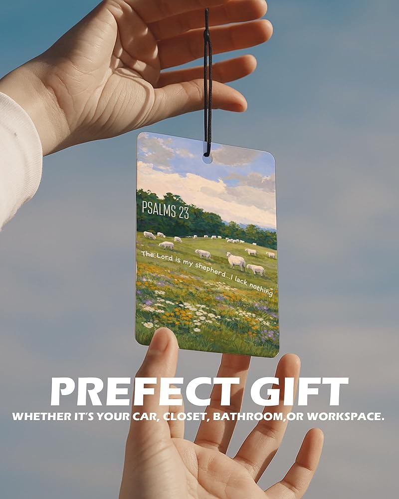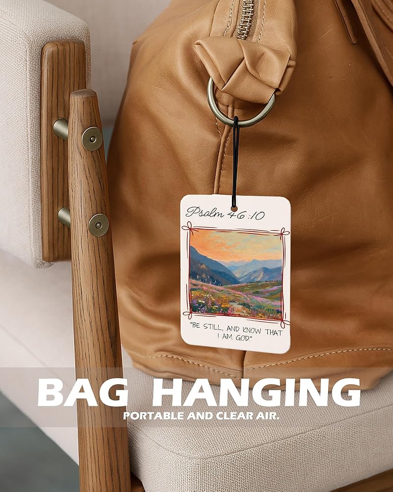 Bring faith and color into your everyday spaces with EKGJW Christian Floral Citrus Air Fresheners. This 4-piece set features vibrant floral landscapes paired with powerful scripture verses. Inspired by peaceful countryside scenes and blooming wildflowers, each design reflects hope, strength, and quiet trust in God. The fresh citrus fragrance provides a clean orange-lemon scent that refreshes your car and small spaces without being overwhelming. A meaningful combination of decorative art and uplifting faith — perfect for women and men who appreciate scripture-inspired decor.