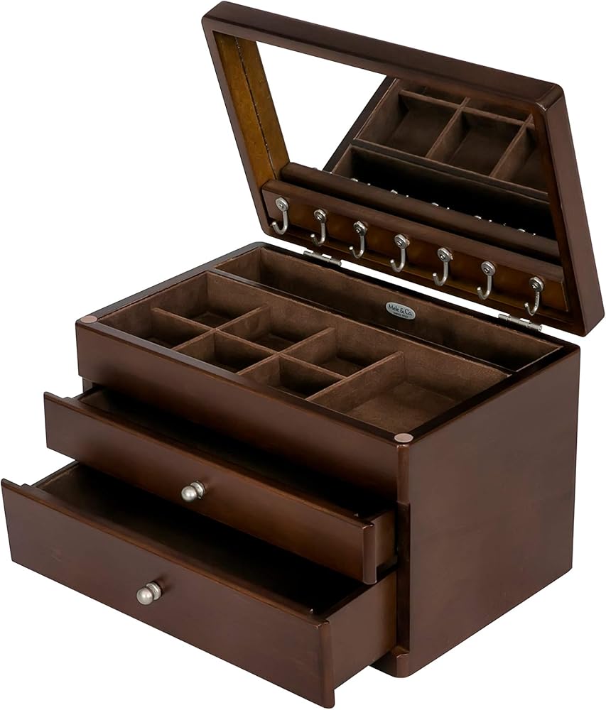 Organize your jewelry in style with the Mele and Co Brisbane Wooden Jewelry Box. This beautifully crafted wooden jewelry chest, finished in Walnut, combines functionality with a classic design. Enhance your jewelry storage with the Mele and Co Brisbane Wooden Jewelry Box. Its thoughtful design and ample storage make it a perfect addition to any jewelry collection.