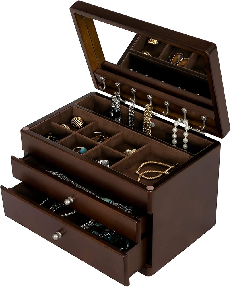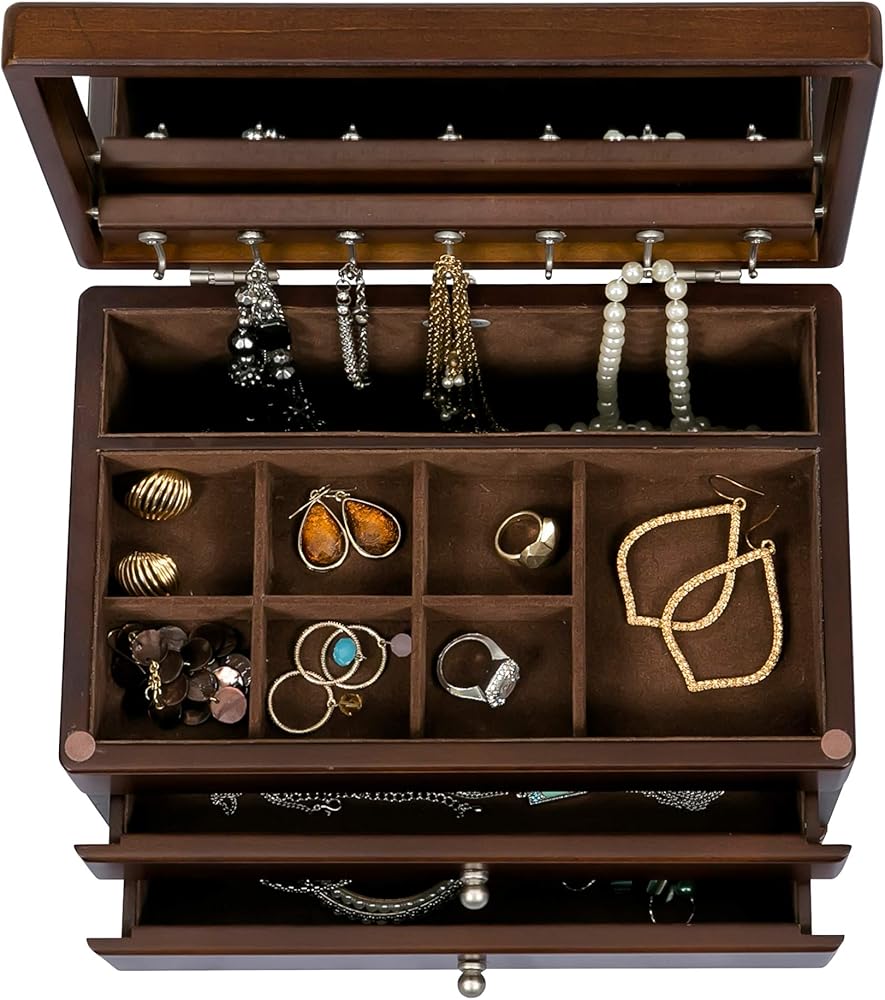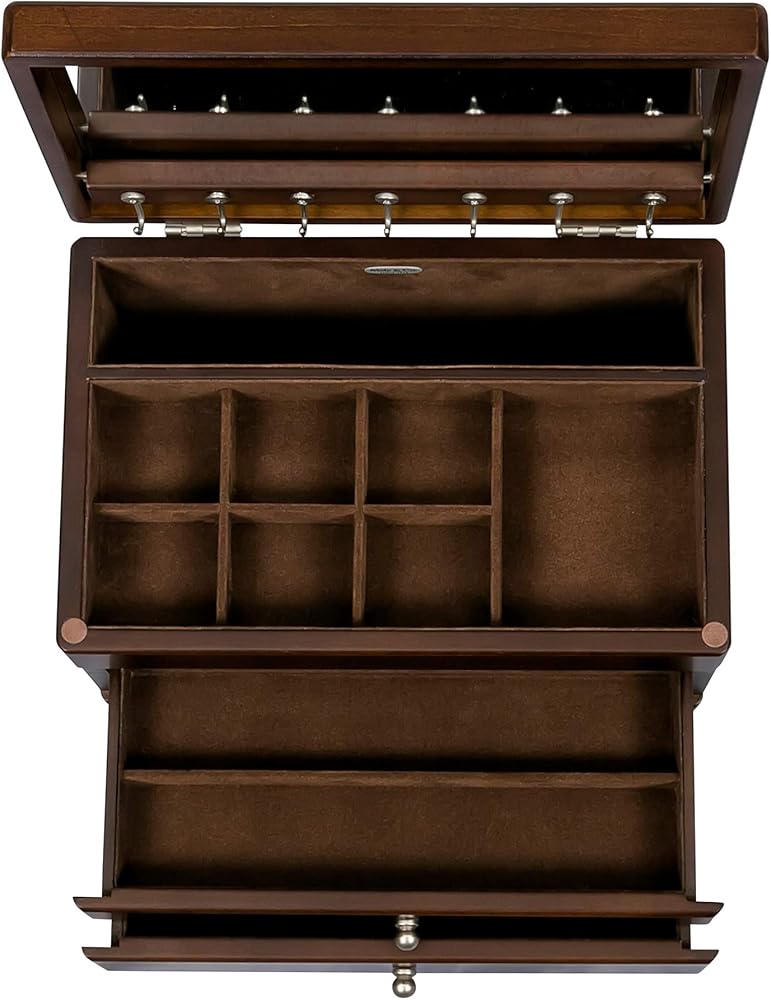 Lift Lid with Full Interior Mirror: The lift lid opens to reveal a full interior mirror, perfect for trying on jewelry.