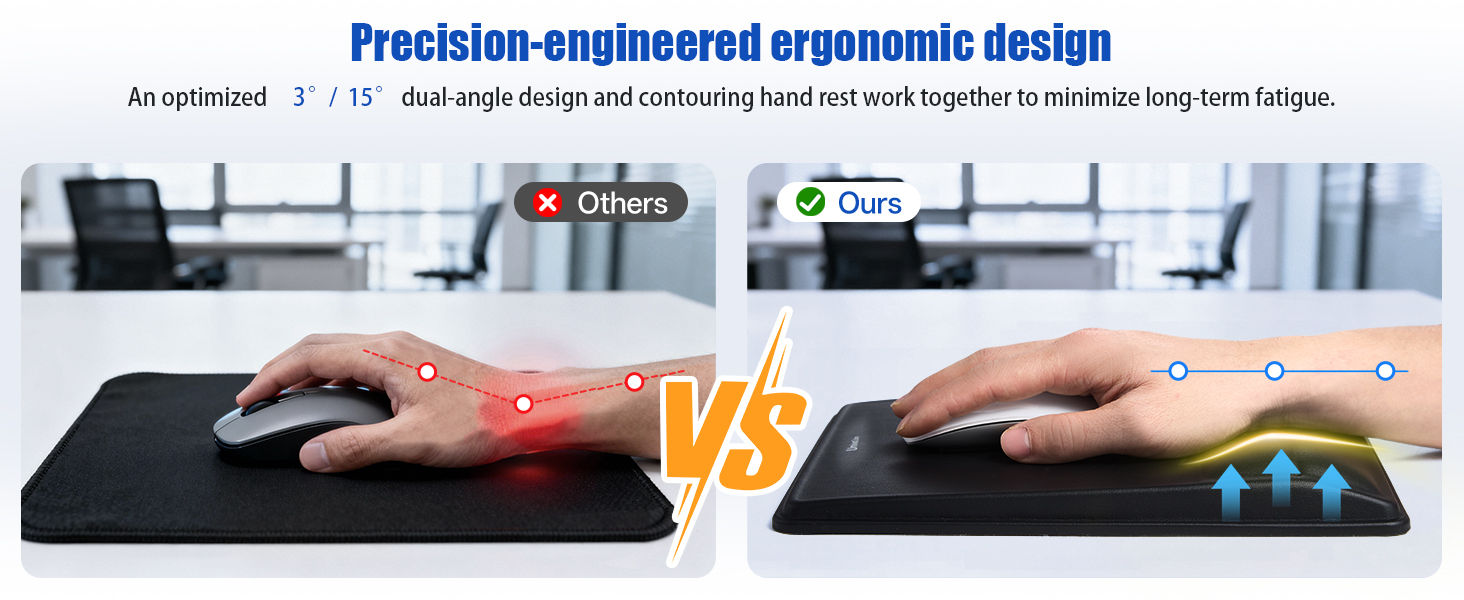 【تصميم مريح ودعم مطابق】 تتميز لوحة الماوس لدينا بمسند معصم مزدوج الانحدار 8 درجات و14 درجة مصمم لتخفيف آلام المعصم وعدم الراحة بشكل فعال. جنبًا إلى جنب مع الإسفنج الذكي المبطن ذو الارتداد البطيء الذي يحيط بمعصمك - ولا يضغط فقط - فهو يوزع الضغط بفعالية لتقليل الضغط وتقليل التعب أثناء جلسات العمل أو الألعاب الطويلة.