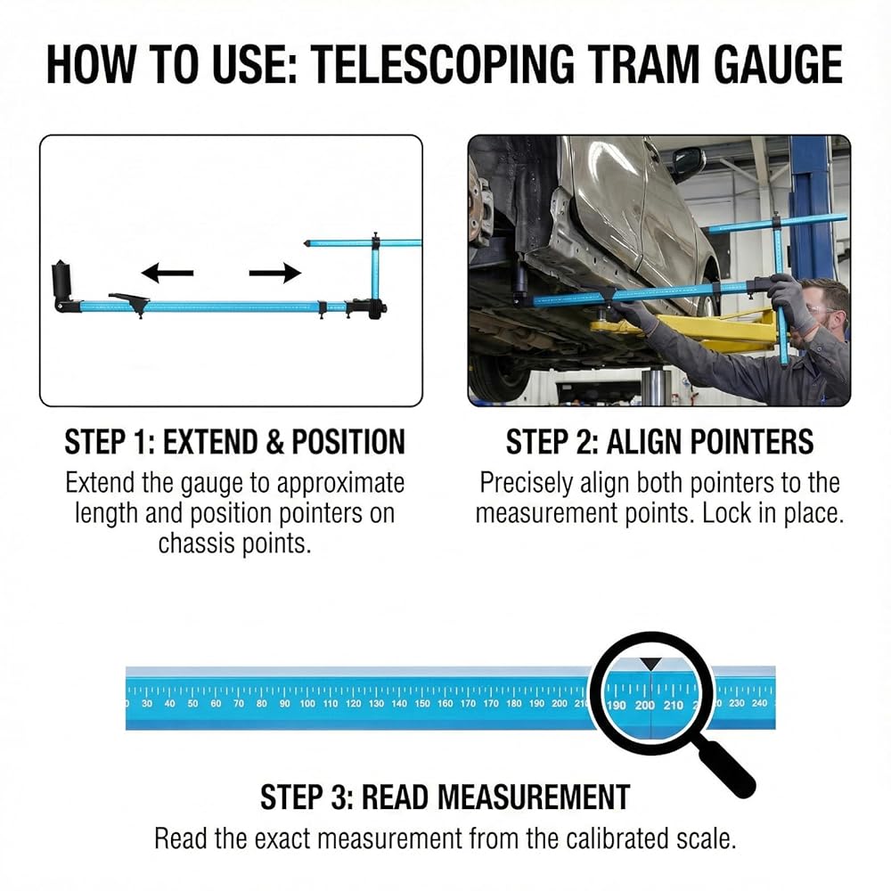 This Tram Gauge is designed for accident vehicle repair and detection. It allows for accurate measurement of multiple vehicle parts including the chassis, doors, windows, trunk, engine compartment, and wheelbase.