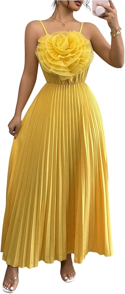 فستان نسائي من OYOANGLE بحزام سباغيتي ثلاثي الأبعاد مزين بالزهور ومطوي بدون أكمام فساتين سهرة واسعة