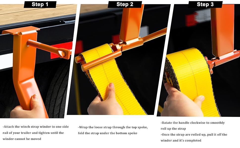 • سهل الاستخدام: قم بتوصيل حزام الرافعة بقضيب جانبي واحد للمقطورة الخاصة بك وشدها، ثم قم بلف الحزام الفضفاض من خلال الجزء العلوي، ثم قم بطي الحزام أسفل الجزء السفلي، ثم قم بتدوير المقبض.