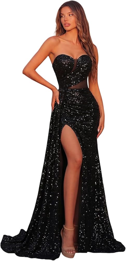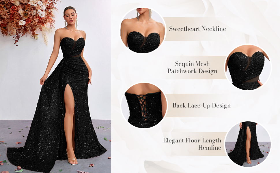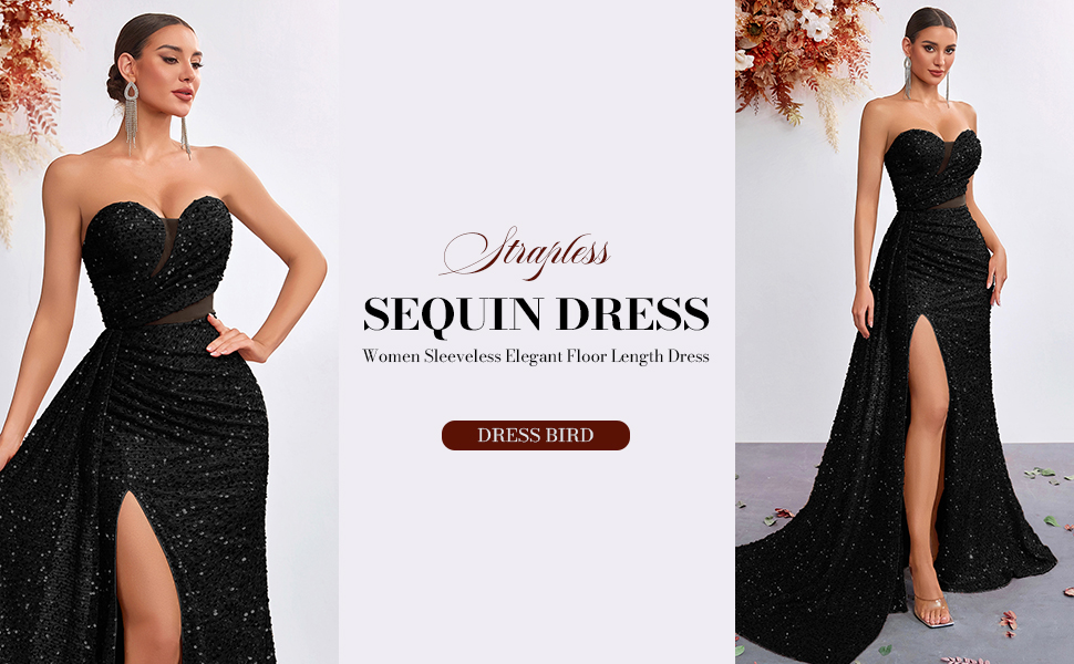 خامة فاخرة: فساتين السهرة الرسمية للنساء مصنوعة من الترتر والتول الفاخر، مقاس نحيف، ناعم ومريح، بدون أكتاف، بدون حمالات، فستان ضيق بتصميم بطول الأرض.