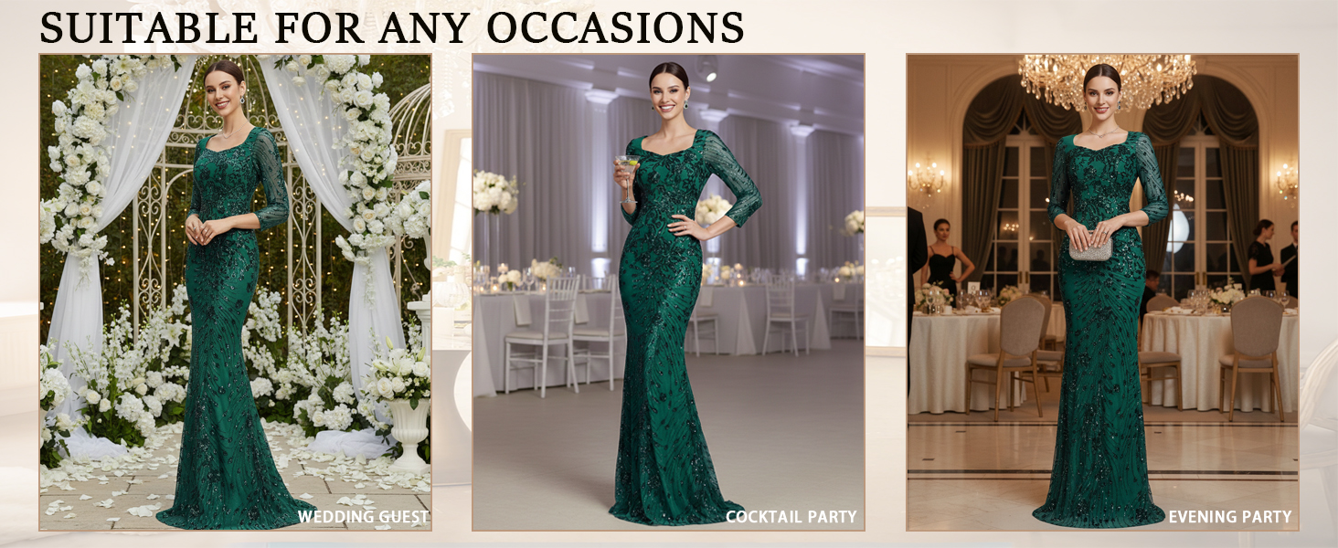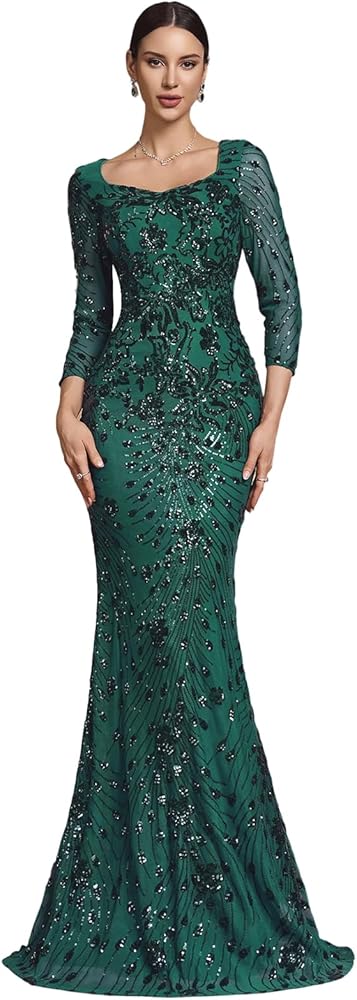 EMBRACE ELEGANT GLAMOR - يجمع فستان السهرة الأنيق هذا بين خط العنق الكلاسيكي على شكل قلب وأكمام رشيقة بطول ثلاثة أرباع، تتدفق إلى صورة ظلية منحوتة على شكل حورية البحر. تم تزيين تصميم الفستان الطويل بتطريزات معقدة من الترتر لمظهر رسمي خالد وجذاب.