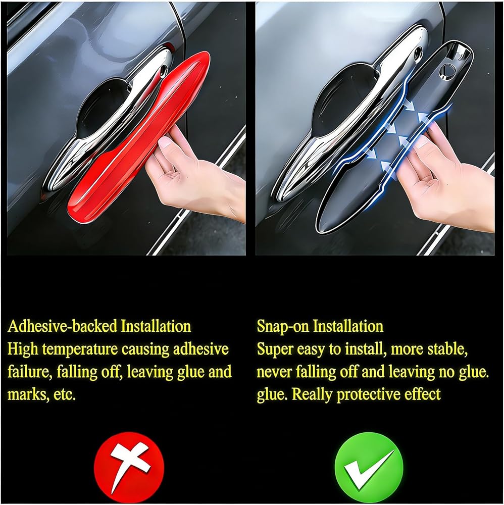 • No Adhesive Installation with a secure hidden snap-on design ensures a firm hold without the risk of glue failure due to heat, eliminating residue, marks, or damage to your original door handles—ideal for hassle-free, clean upgrades.