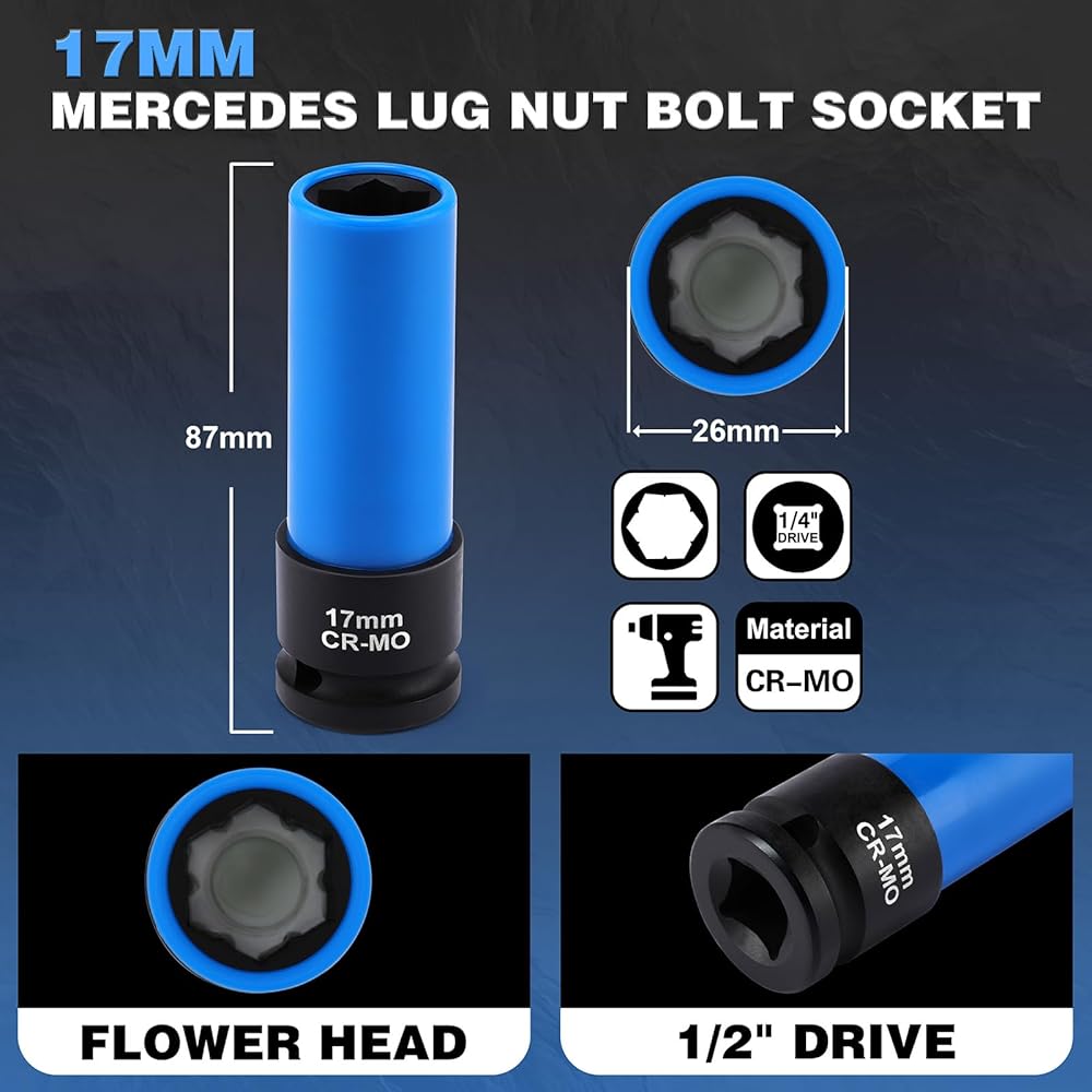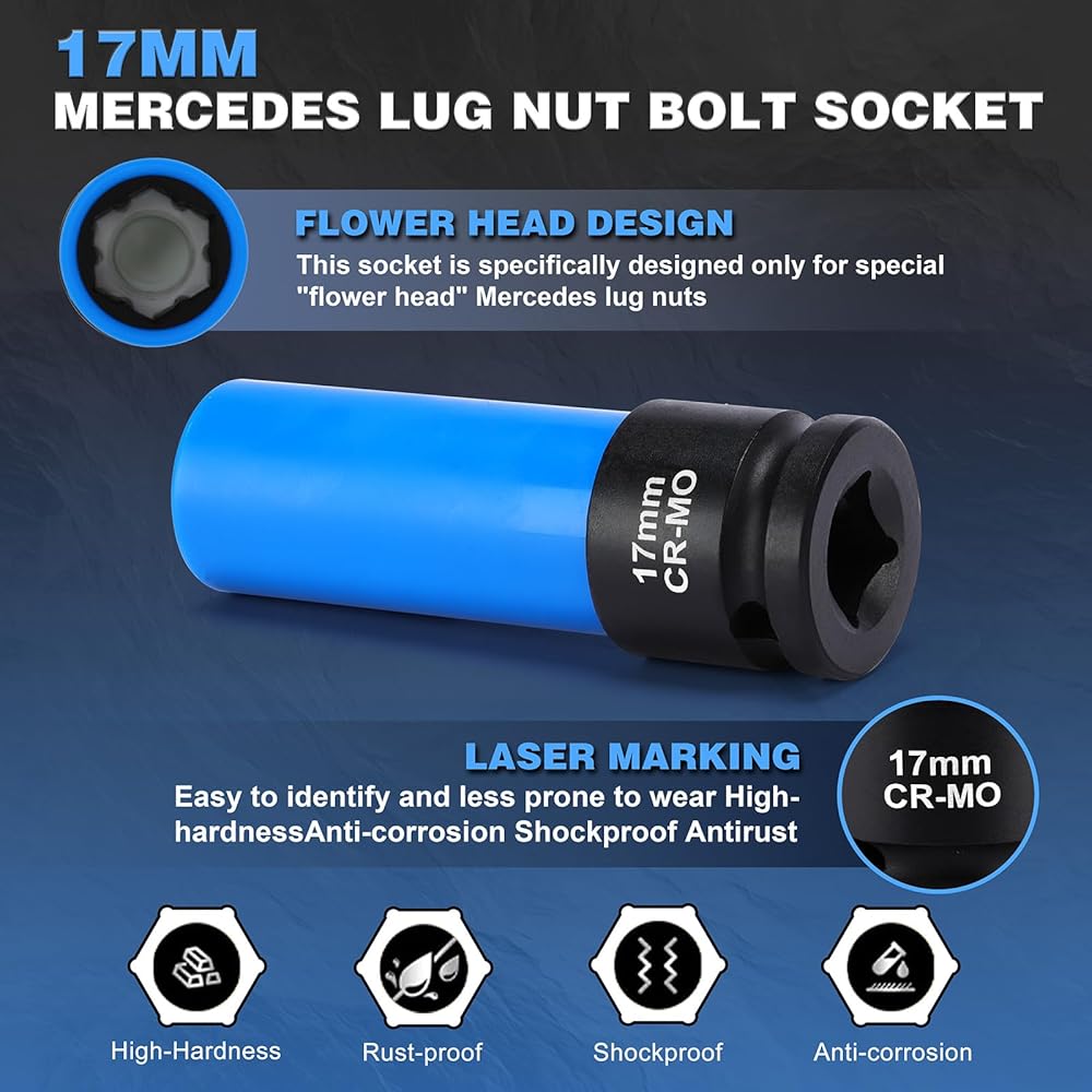 ✅【PRODUCT SPECIFICATIONS】17mm Convex Socket for Mercedes Lug Nuts and Bolts; 1/2 Inch Square Drive; Compatible with 2007+ Mercedes CL-Class, GL-Class, GLK-Class, GLS-Class, and S-Class vehicles with 17mm convex, “flower head” lug bolts.