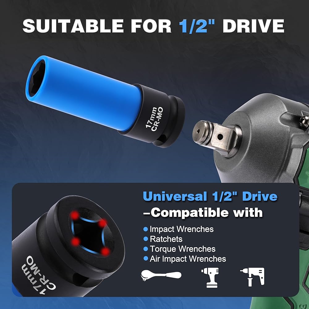 ✅【1/2-INCH SQUARE DRIVE】This socket is compatible with a 1/2-inch impact wrench. It can be used with hand, electric, or air tools.