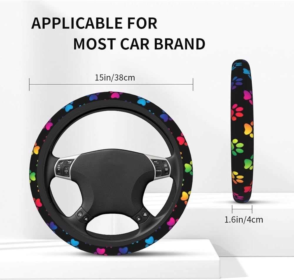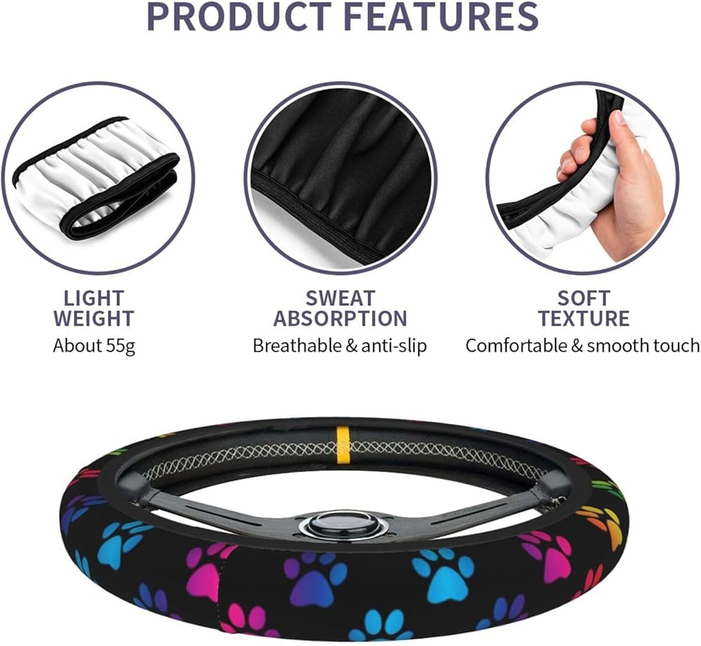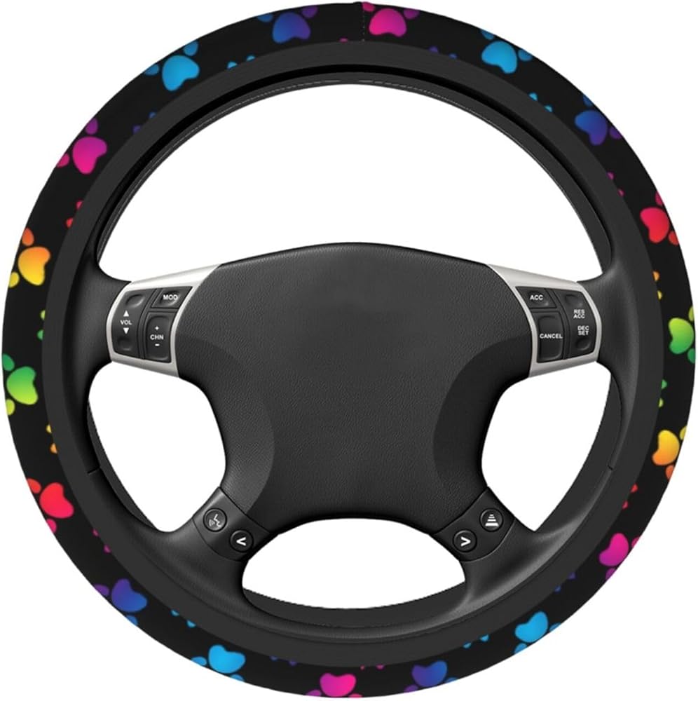 [Easy Installation:] Our flexible cover is easy to install and clip on. The rainbow color paw print steering wheel cover is easy to install without a need of other tools. The cloth steering wheel cover can be installed in seconds, and it has great flexibility.