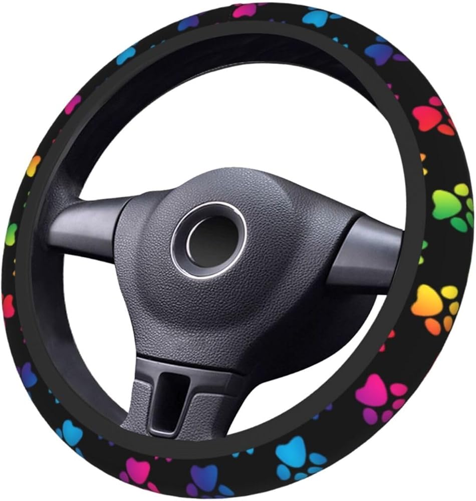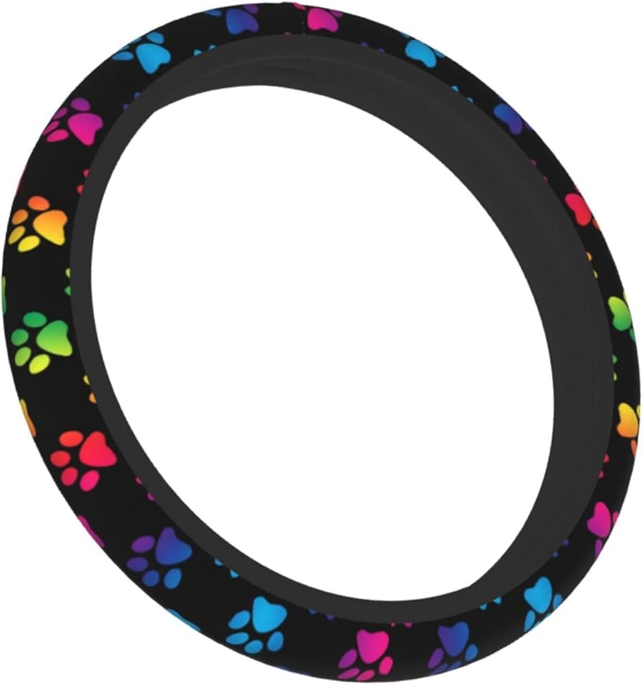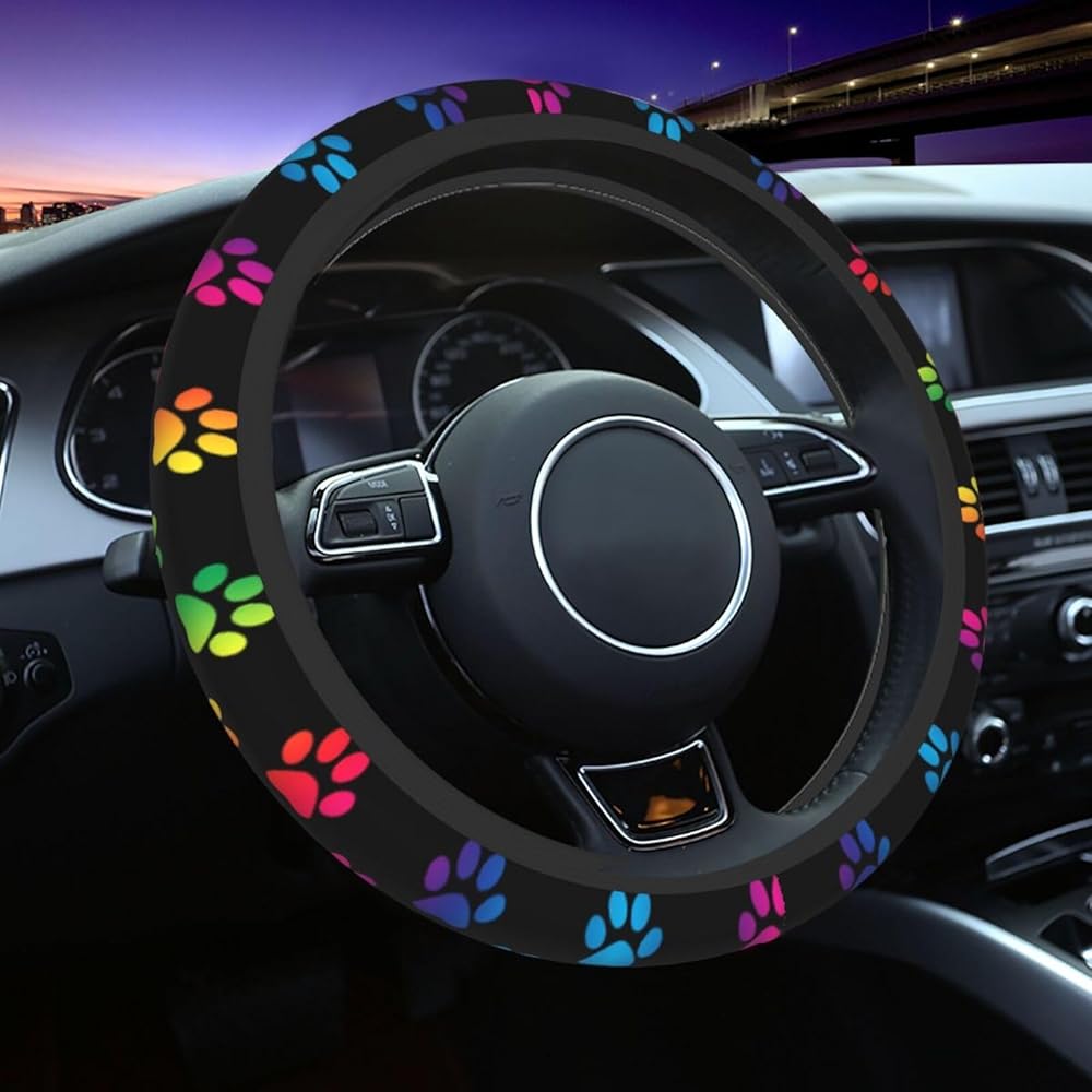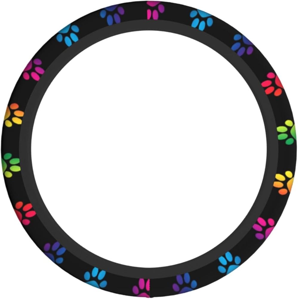 [Easy Installation:] Our flexible cover is easy to install and clip on. The rainbow color paw print steering wheel cover is easy to install without a need of other tools. The cloth steering wheel cover can be installed in seconds, and it has great flexibility.