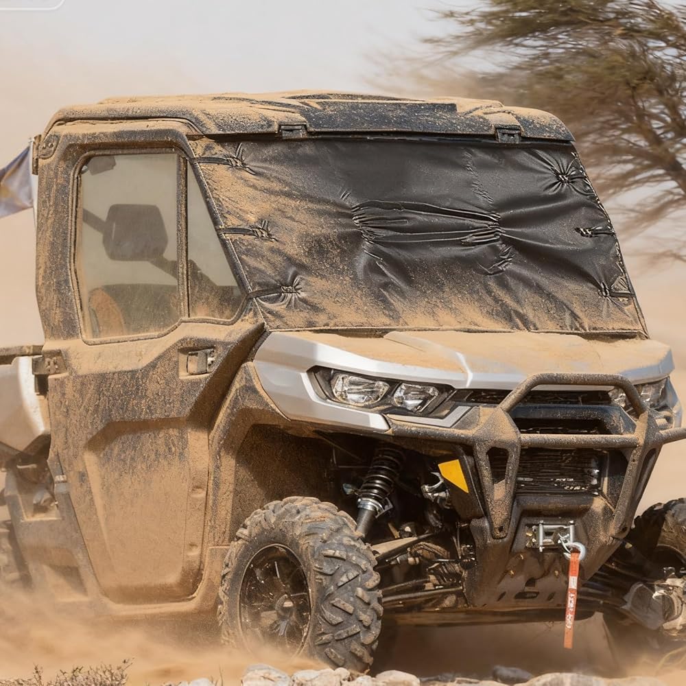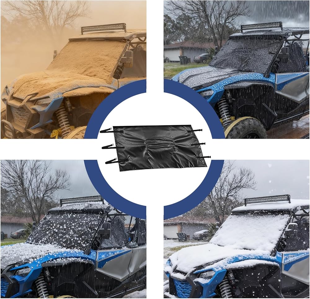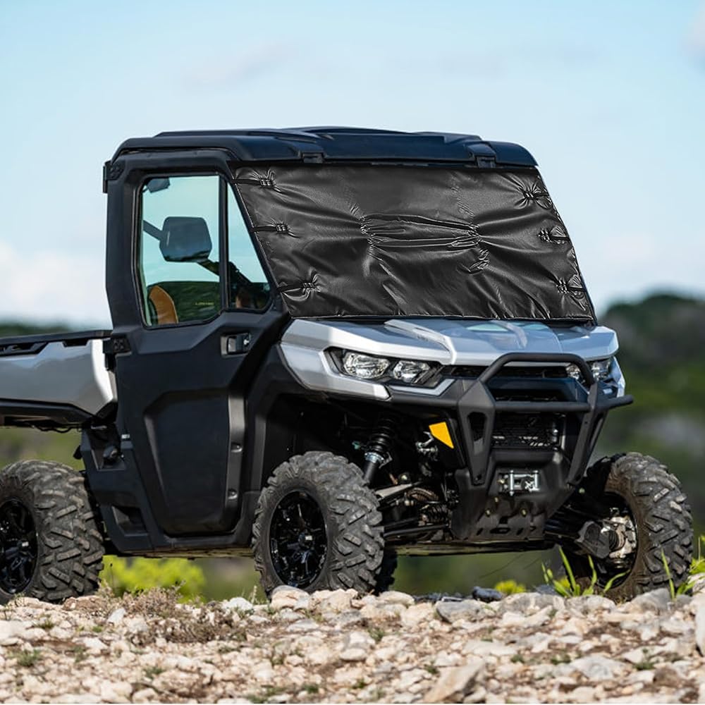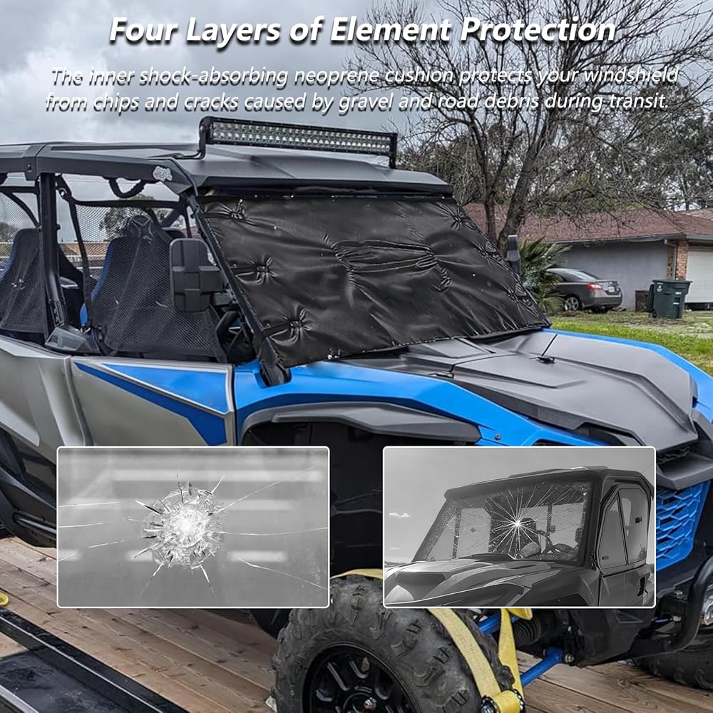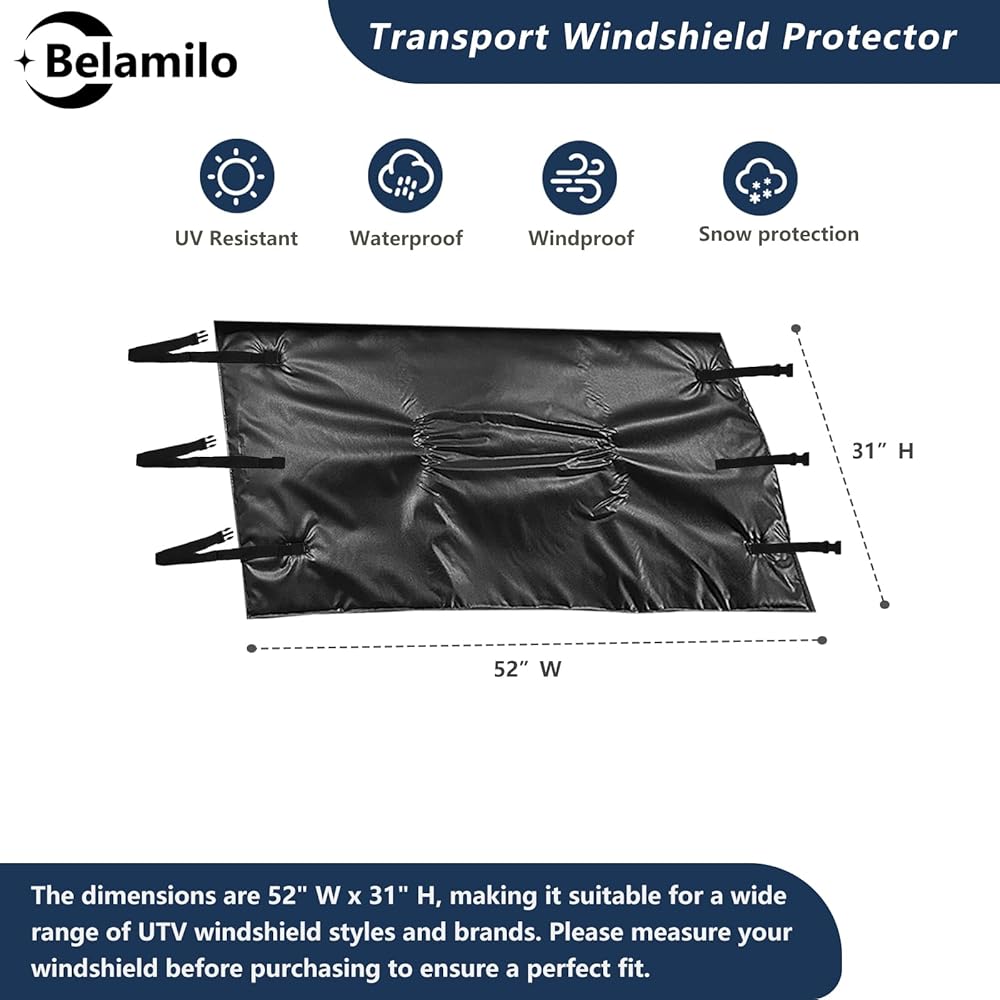 Heavy-Duty Transport Windshield Protector: The dimensions are 52" W x 31" H, making it suitable for a wide range of UTV windshield styles and brands. Please measure your windshield before purchasing to ensure a perfect fit.