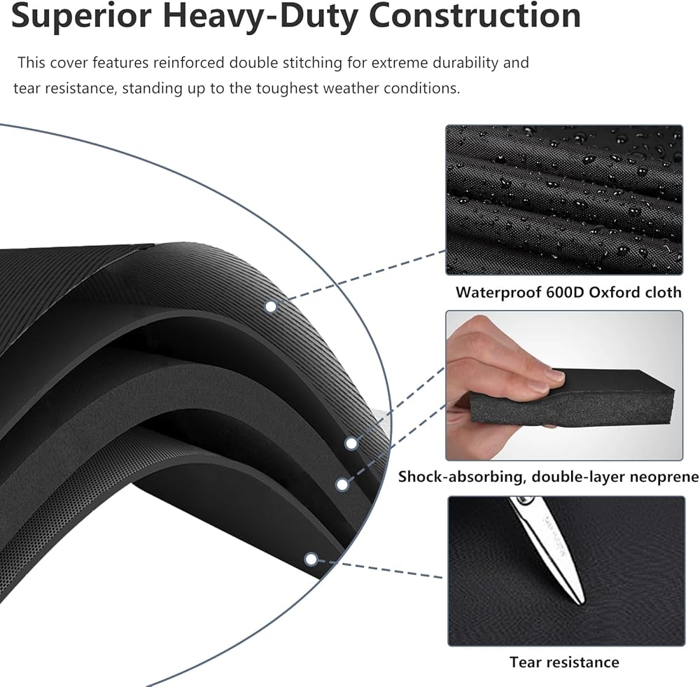 Superior Heavy-Duty Construction: Built with waterproof 600D Oxford cloth and shock-absorbing, double-layer neoprene, this cover features reinforced double stitching for extreme durability and tear resistance, standing up to the toughest weather conditions.
