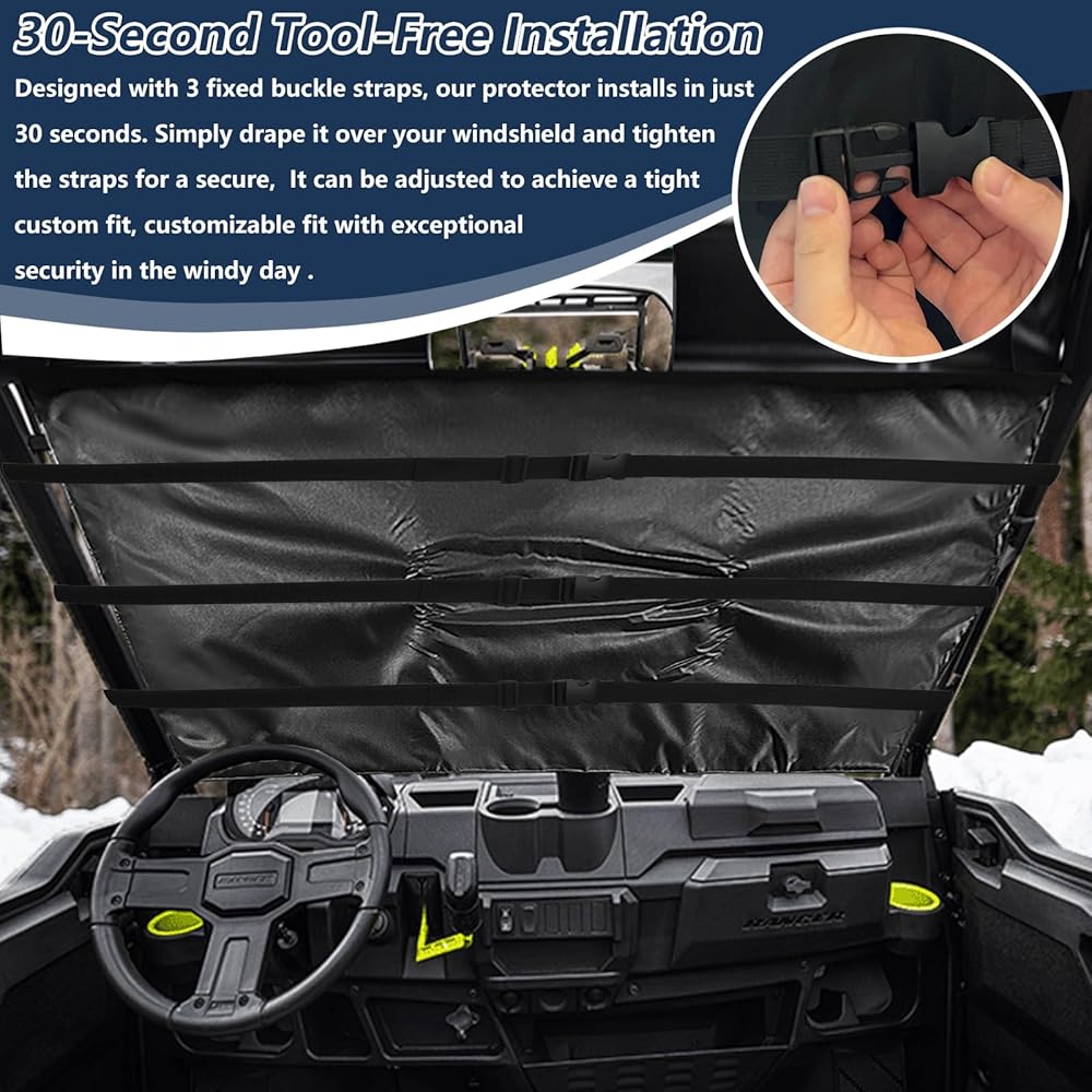 30-Second Tool-Free Installation: Designed with 3 fixed buckle straps, our protector installs in just 30 seconds. Simply drape it over your windshield and tighten the straps for a secure, It can be adjusted to achieve a tight custom fit, customizable fit with exceptional security in the windy day .