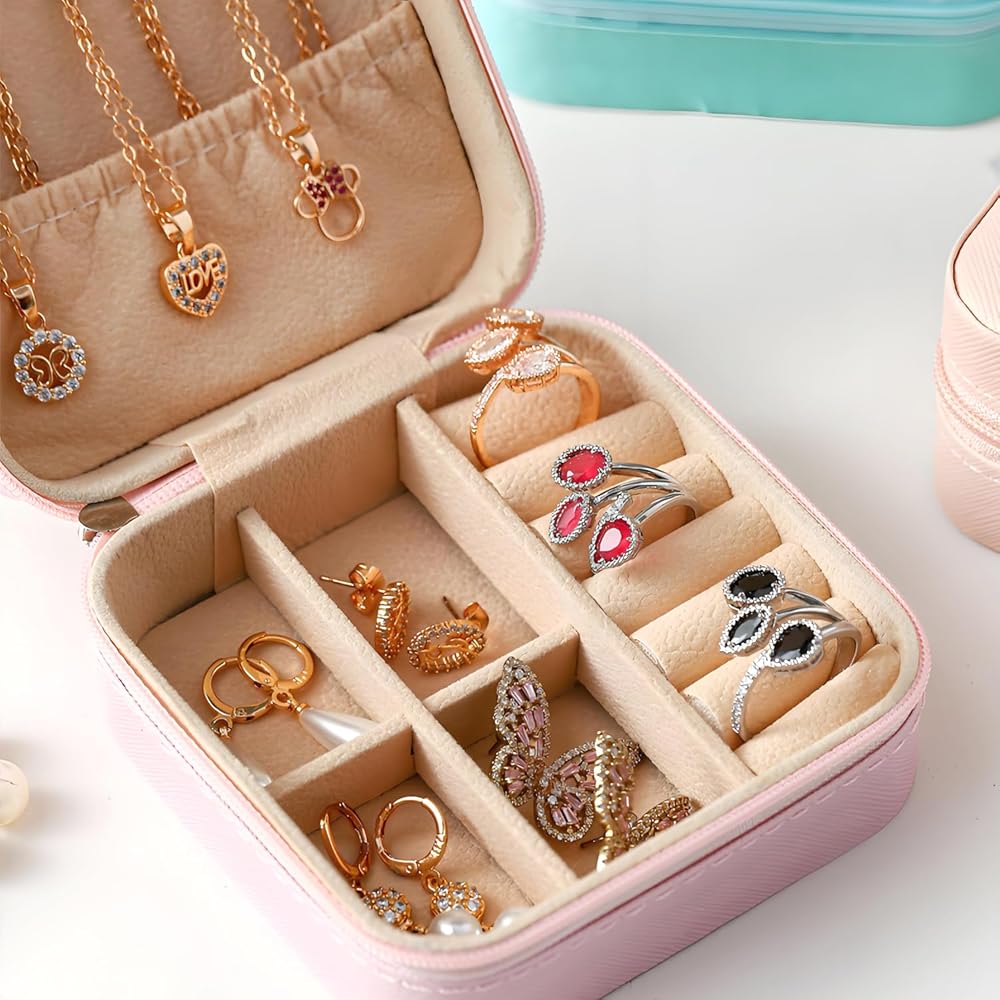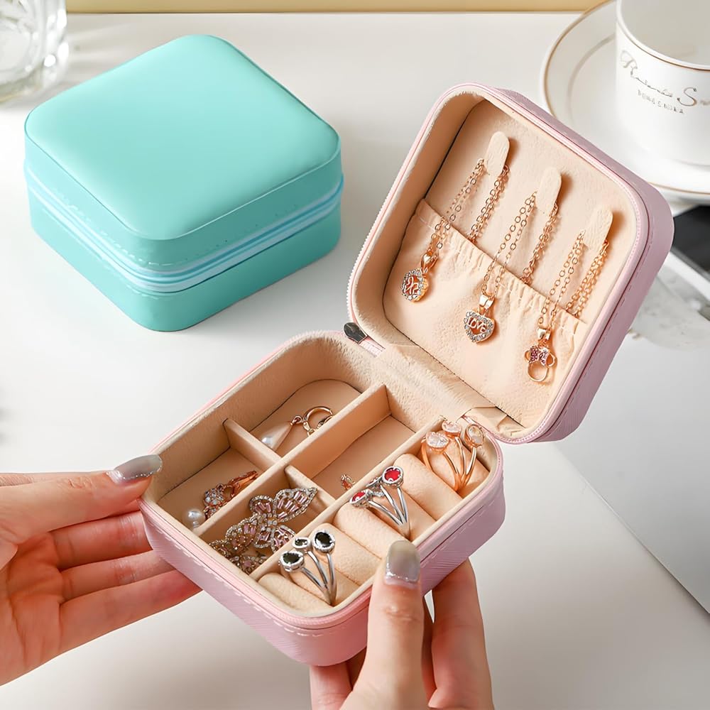 -Multi-Function Storage: This mini jewelry travel case can be used for daily storage, or to carry on business trips and travel. It is compact but can hold much jewelry with high capacity. The jewelry box include a pocket, hooks for necklaces, divided compartments and cases for rings. Put your jewelry in the appropriate place to make them neat.