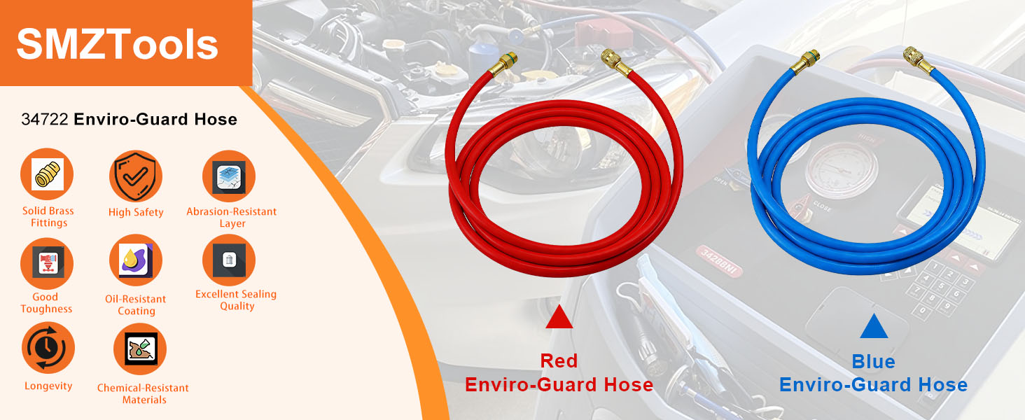 【توافق دقيق مع الماكينة】مجموعة خرطوم Enviro-Guard 34722 هذه هي بديل مباشر لآلات Robinair 34788 و34288 و34134Z RRR. تم تصميم زوج الخرطوم الأحمر والأزرق بطول 9 أقدام خصيصًا لخدمة تبريد السيارات R-134a، مع علامات R-134a واضحة لتحديد سريع واستخدام خالٍ من الأخطاء.