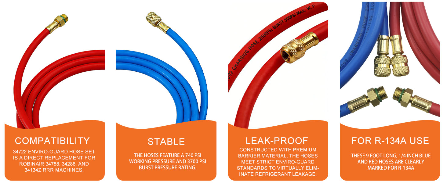مجموعة خرطوم حماية البيئة 9FT 34722 لخراطيم Robinair Hvac، مجموعة خرطوم حماية Enviro باللون الأحمر والأزرق R-134a لآلات Robinair 34788، 34288، 34134Z RRR، ضغط عمل 740 رطل لكل بوصة مربعة / ضغط انفجار 3700 رطل لكل بوصة مربعة