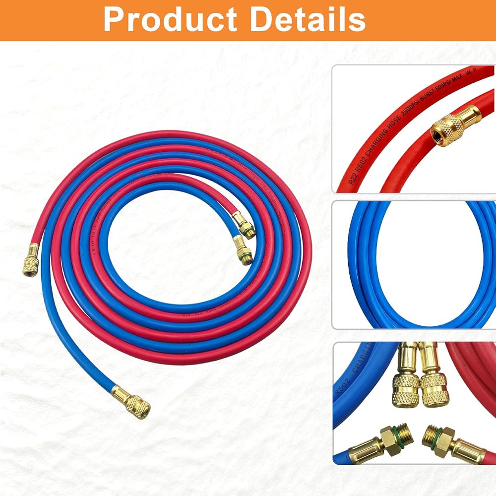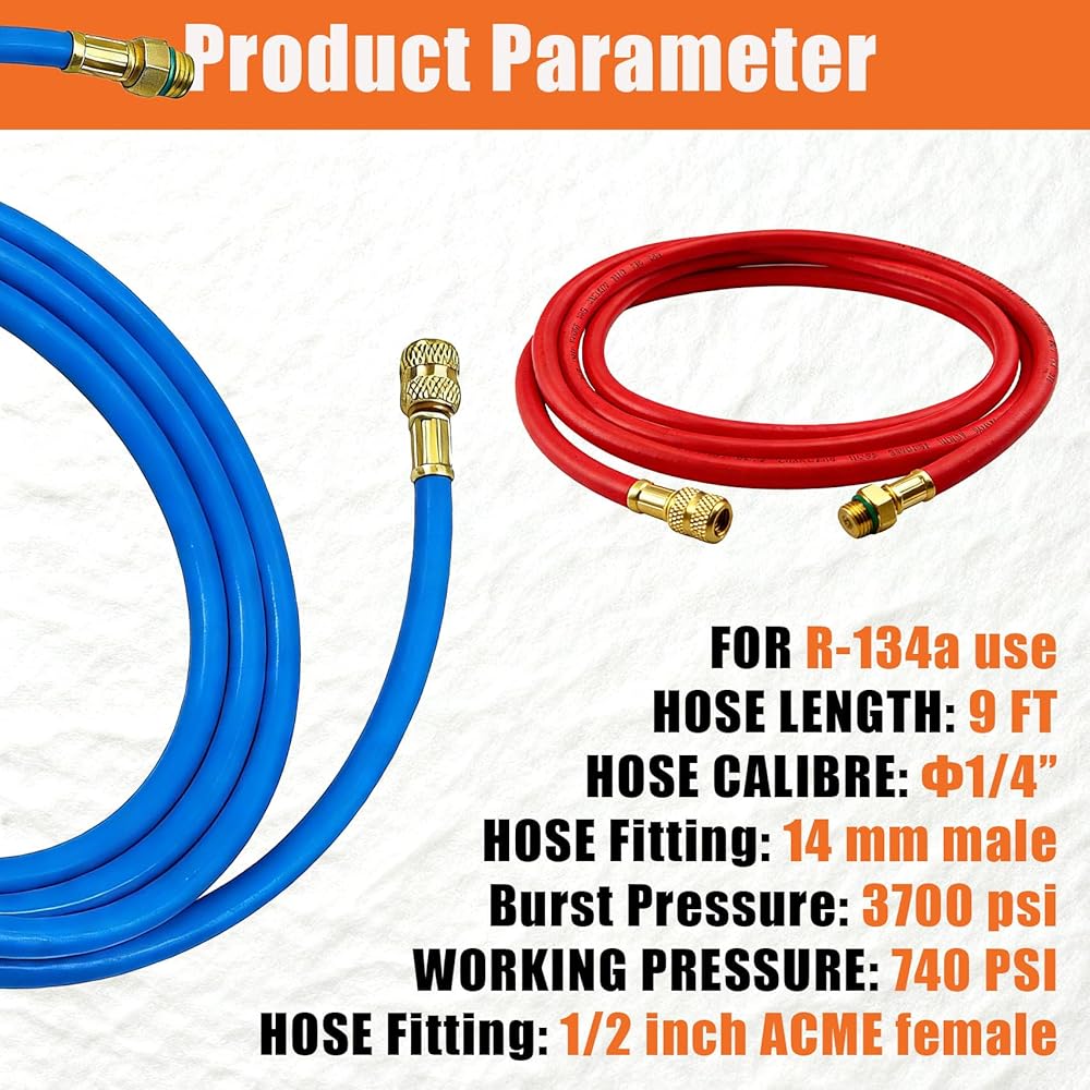 【توافق المواصفات والملاءمة】تشتمل مجموعة الخراطيم هذه على خراطيم حمراء وزرقاء بطول 9 أقدام وقطر 1/4 بوصة تحمل علامة واضحة لاستخدام المبرد R-134a، مما يسمح بالتعرف السريع والخالي من الأخطاء أثناء التشغيل. تم تجهيز كل خرطوم بتركيبات أنثى ACME مقاس 14 مم × 1/2 بوصة، مما يضمن اتصالًا محكمًا وموثوقًا مع واجهات ماكينة RRR المتوافقة