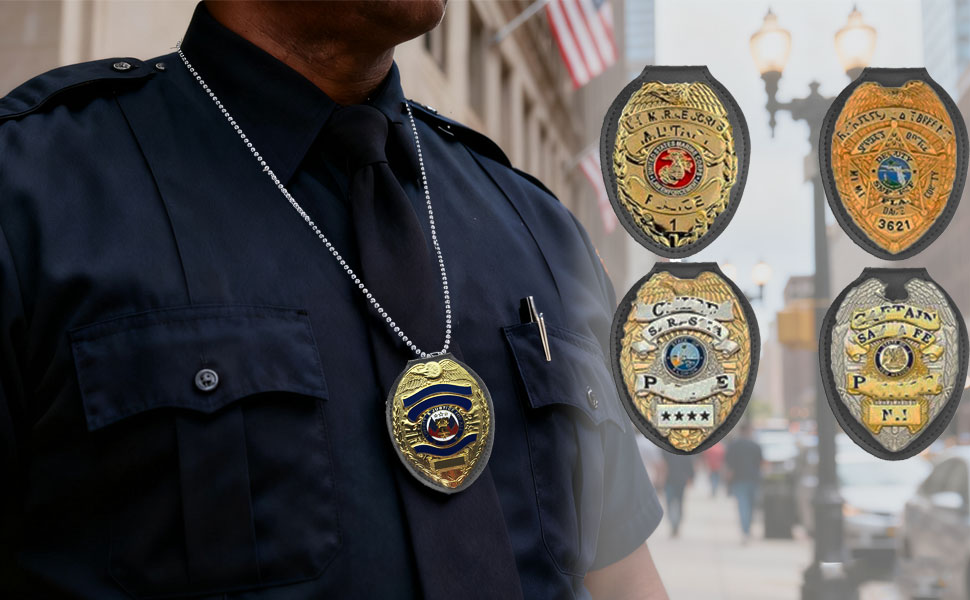 تتضمن سلسلة كروية من الفولاذ المقاوم للصدأ، مناسبة للارتداء حول الرقبة أو ربطها بالحزام. متوافقة مع شارات الشرطة المستديرة والخماسية والسداسية والسباعية. مناسب بشكل أفضل للشارات الدبوسية، ولكن يمكن استخدامه أيضًا لبعض الشارات المشبكية.