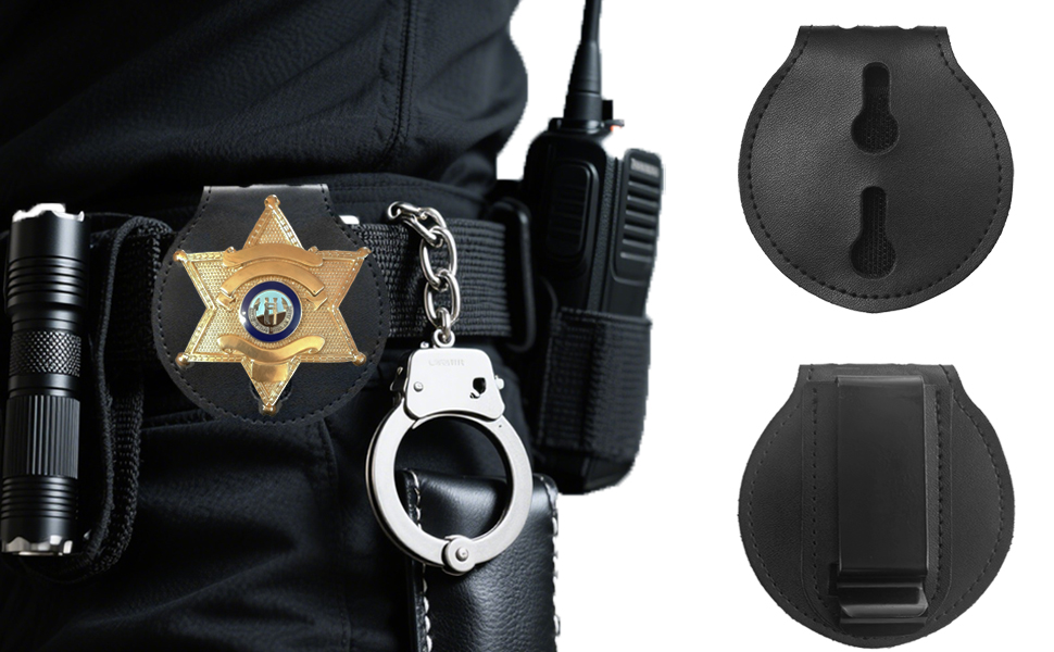 حامل شارة إنفاذ القانون مصنوع من جلد البقر الأصلي، وليس من البولي يوريثان. يتميز بمشبك معدني، وسلسلة من الفولاذ المقاوم للصدأ، ومشبك لاصق متين. تتميز بحرفية دقيقة مع خياطة متساوية وتصميم احترافي.