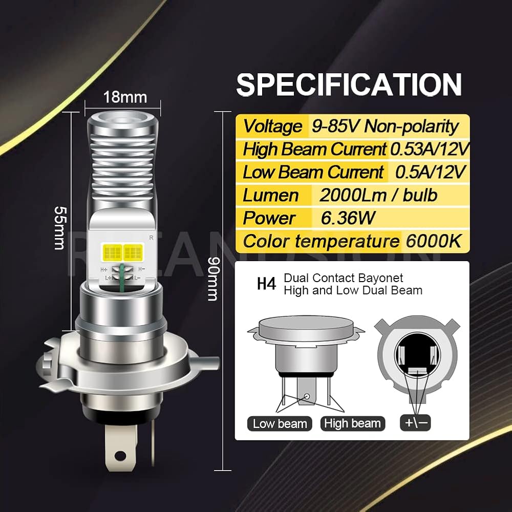【Specifications】 This H4 LED motorcycle light bulb is equipped with Super Bright COB Chips. Voltage: DC/AC 9-85V (12V 24V).Lumen: 2000lm. Color: White.