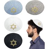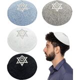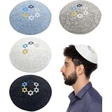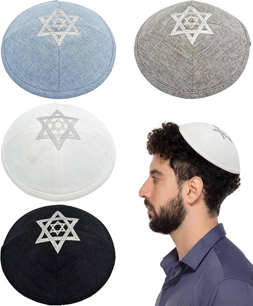 Elevate your traditional Jewish attire with this set of 4 high-quality linen kippot, Each pack includes four kippahs in coordinated classic colors – White, Gray, Black, and Light Blue – all featuring a single embroidery design based on your selected style (Side Star, Center Star, Colorful Stars, or Israeli-American Flag Star).