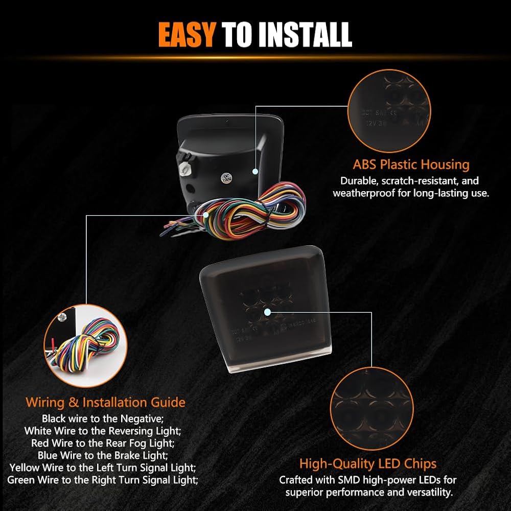 【سهلة التركيب】: تقنية التثبيت سهلة الاستخدام لدينا لا تتطلب أي حفر وتستغرق حوالي 5-15 دقيقة. سلك أسود على الأرض. سلك أبيض للضوء العكسي؛ سلك أحمر لمصباح الضباب الخلفي؛ السلك الأزرق لضوء الفرامل، والسلك الكهرماني، والسلك الأخضر لضوء إشارة الانعطاف. لمنح سيارتك تأثير إضاءة فريدًا. إنه تحسين بسيط يعزز تجربة القيادة الخاصة بك.