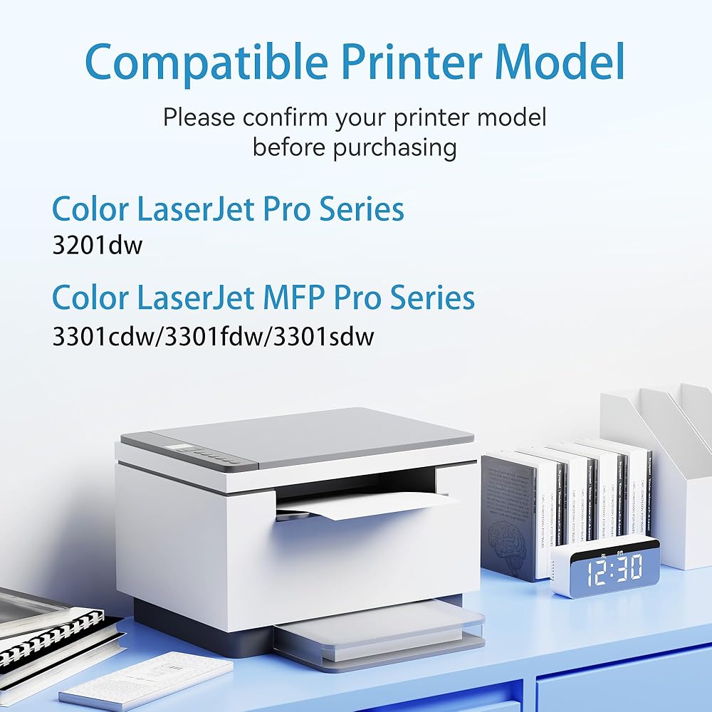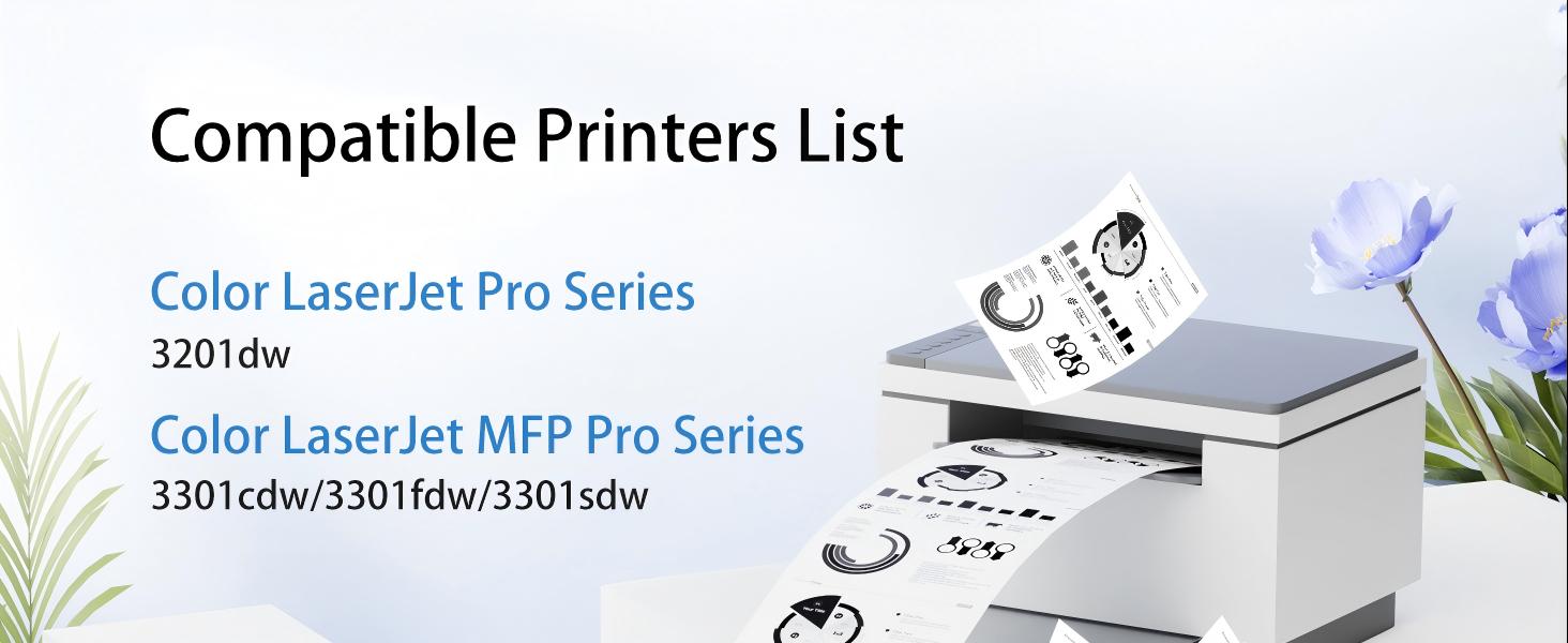 الطابعات المتوافقة: متوافقة مع طابعة HP Color Laserjet Pro 3201dw، وColor Laserjet Pro MFP 3301fdw، وColor Laserjet Pro MFP 3301cdw، وColor Laserjet Pro MFP 3301sdw