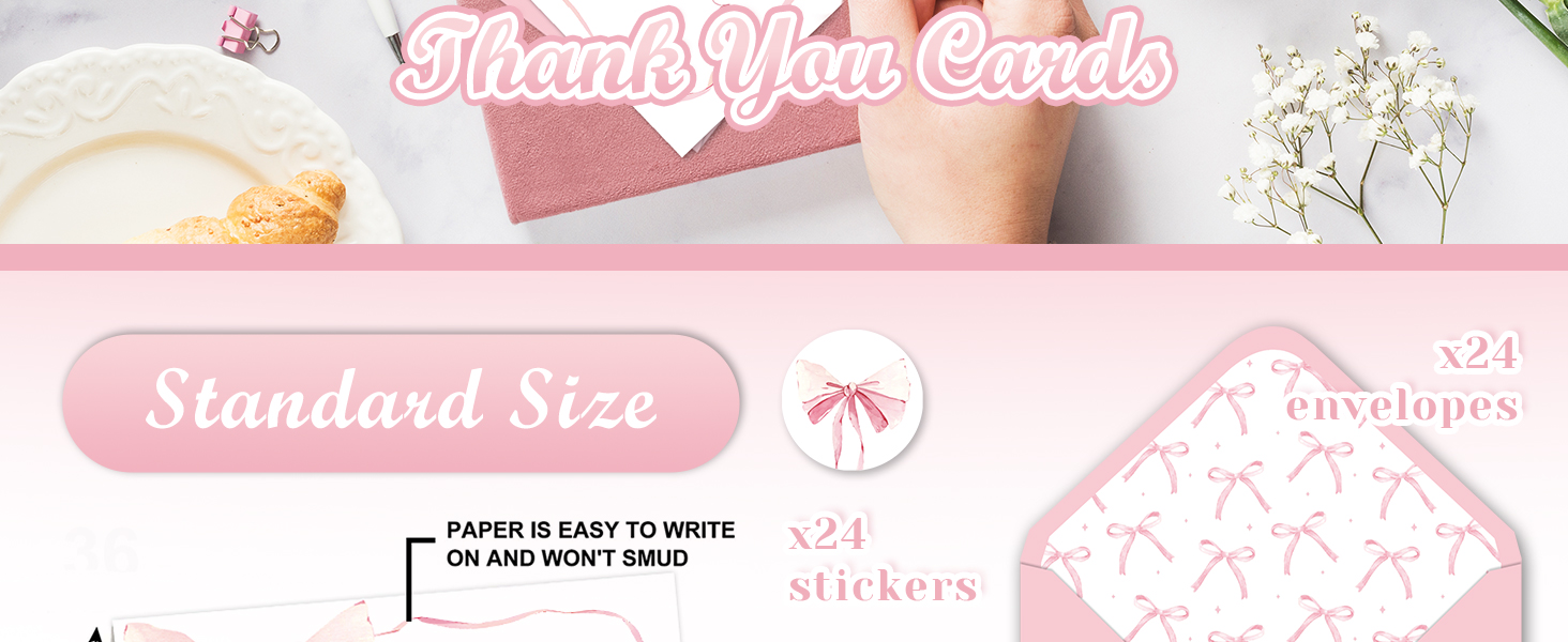 • تصميم دقيق: تم تصميم بطاقات التهنئة الخاصة بنا بأقواس وردية ومطبوعة بكلمات شكرًا لك، تصميم أنيق وجميل يجعلها مناسبة للعديد من المناسبات