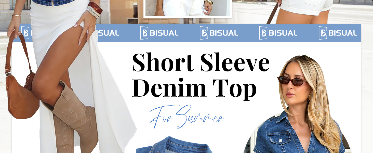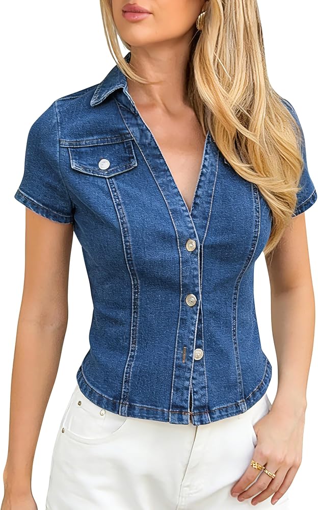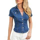 قميص نسائي من قماش الدنيم بأزرار سفلية وأكمام قصيرة ورقبة على شكل حرف V وقصة ضيقة للصيف كاجوال
