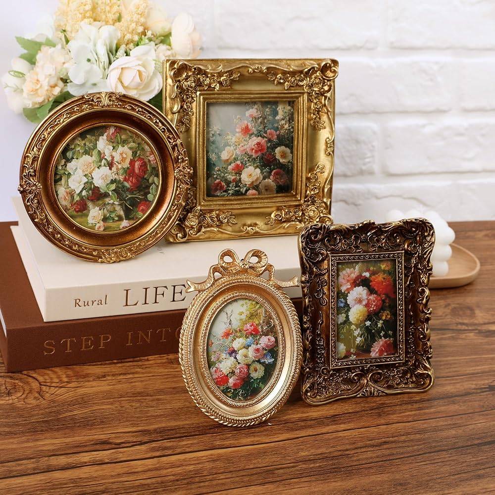 Set of 4 Small Vintage Photo Frames - Gold Ornate Antique Picture Frames for Wall Hanging & Tabletop Display, Mixed Sizes: Round & Rectangle Home Decor (5.7"x4.7", 5.5"x5.5", 3.7"x5.3", 6.3"x6.3")