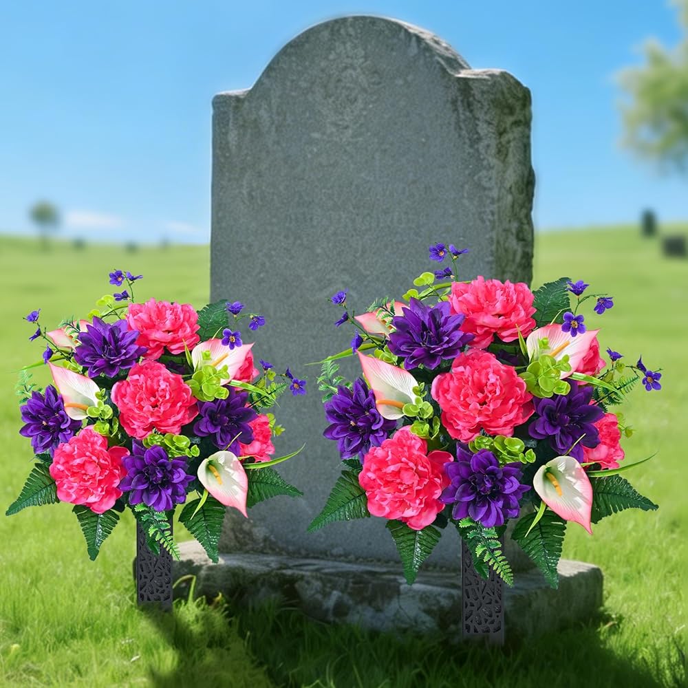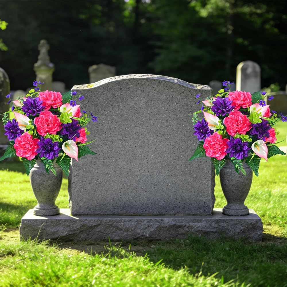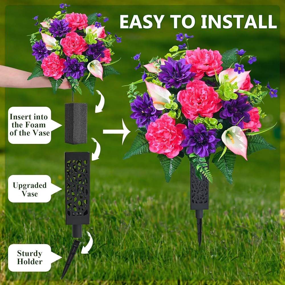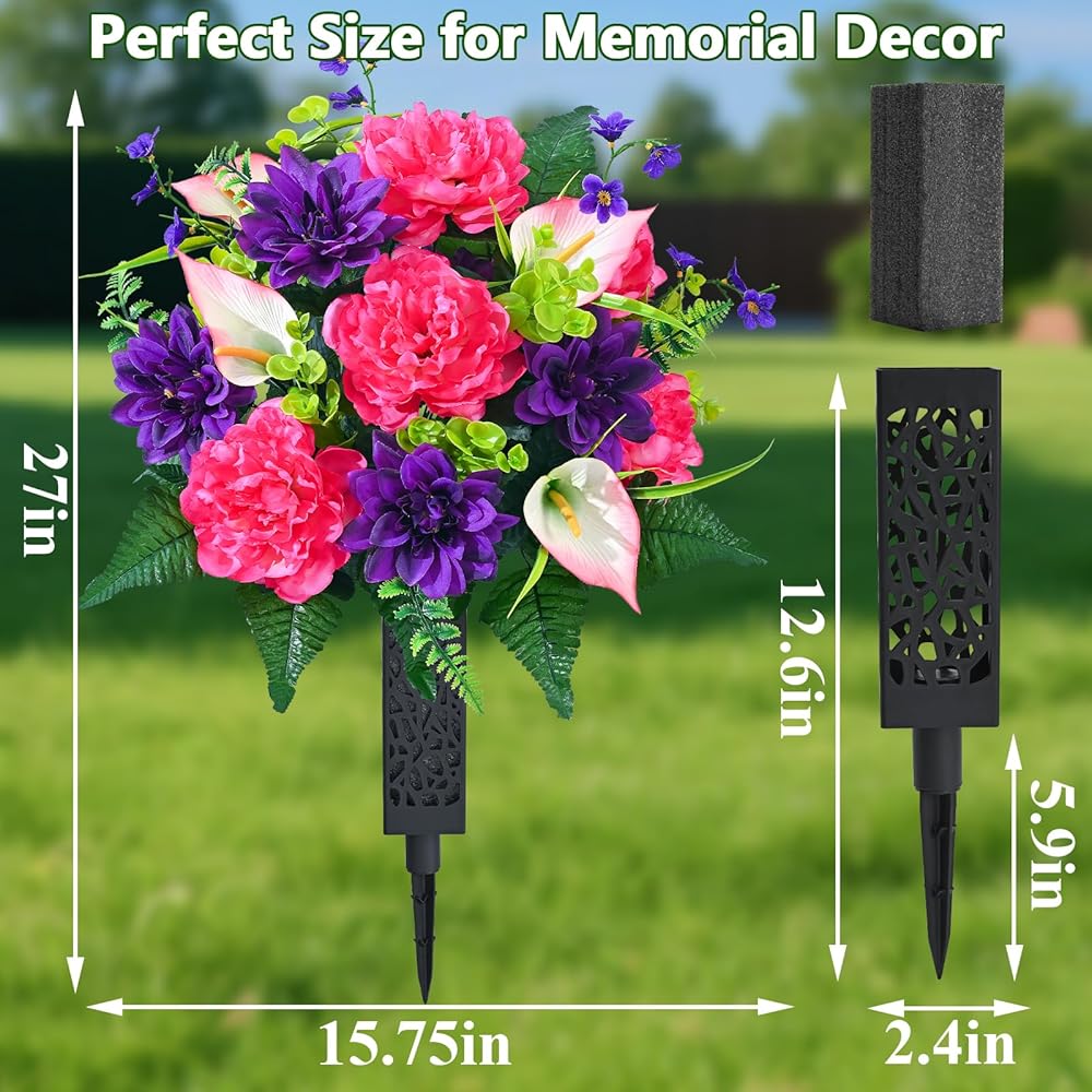 • 【Perfect Size, Easy Installation】 Each bouquet of artificial flowers for cemetery is 27 inches tall and 15.75 inches wide, making it an ideal choice for decorating most tombstones. The set includes 2 bouquets of flowers and 2 flower vases with ground inserts. The product can be assembled right after opening the box. You just need to gently arrange them, and they will regain their full shape, saving you time and effort.