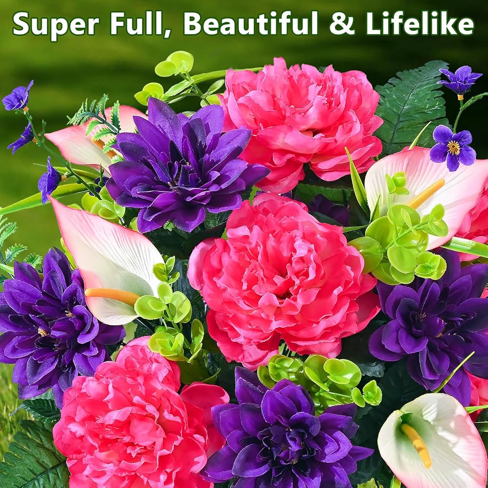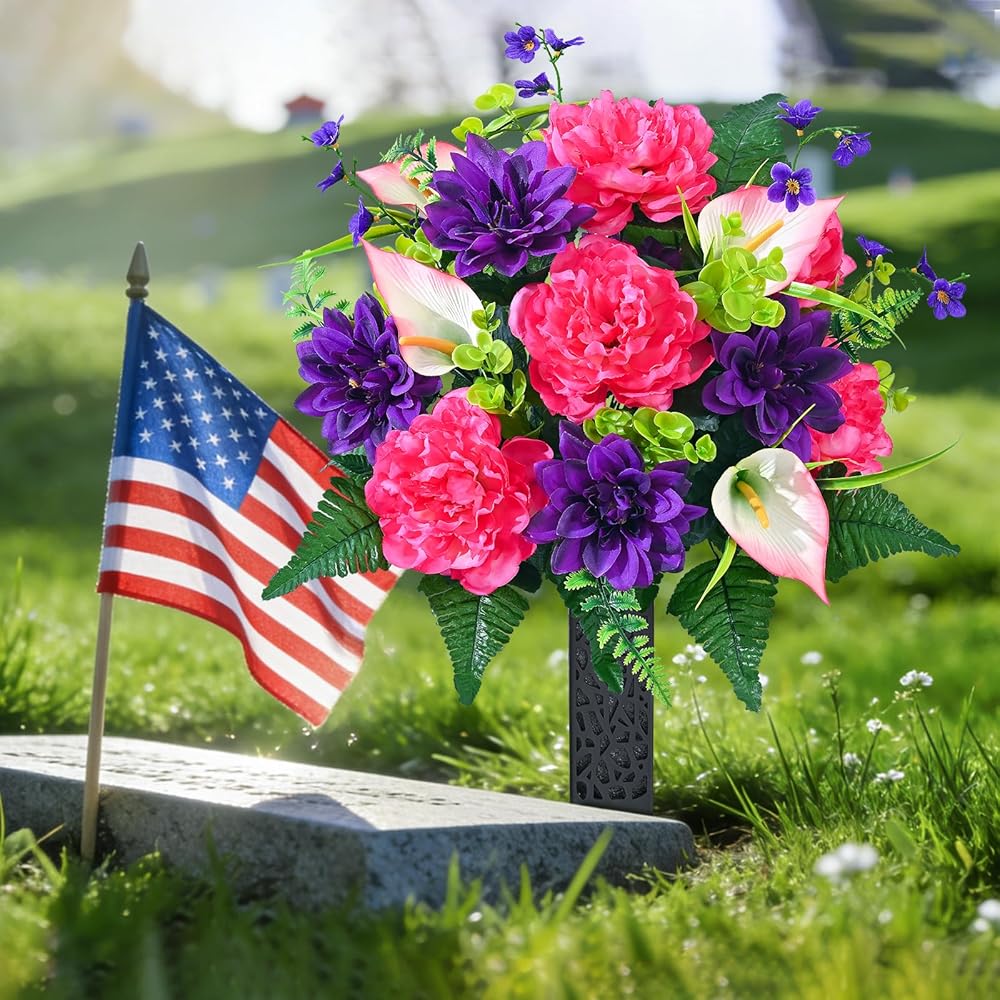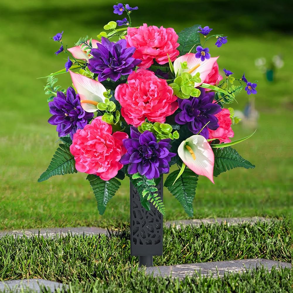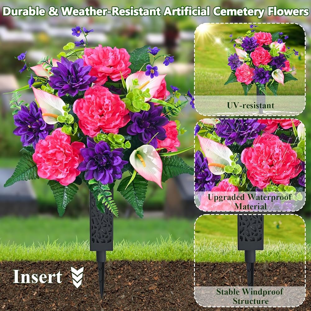 • 【Perfect Size, Easy Installation】 Each bouquet of artificial flowers for cemetery is 27 inches tall and 15.75 inches wide, making it an ideal choice for decorating most tombstones. The set includes 2 bouquets of flowers and 2 flower vases with ground inserts. The product can be assembled right after opening the box. You just need to gently arrange them, and they will regain their full shape, saving you time and effort.