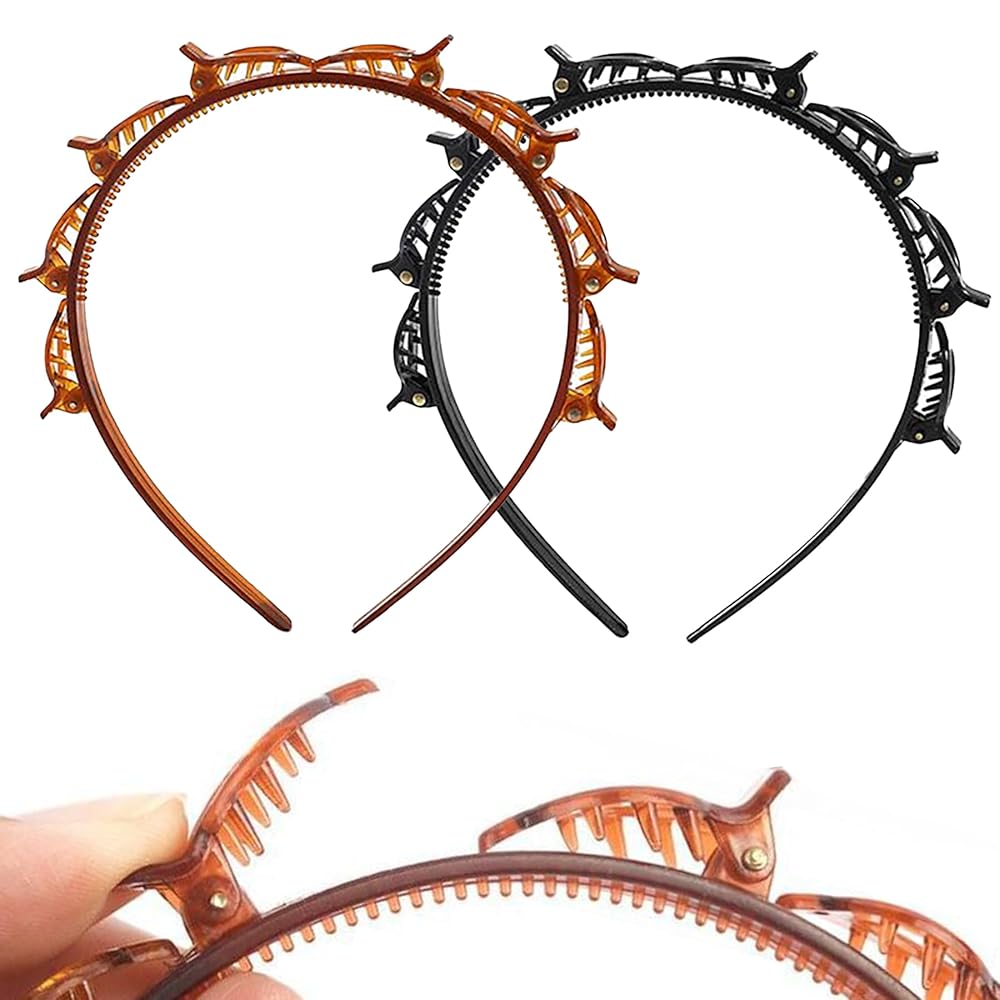 قطعتان من عصابة الرأس مع مشابك للنساء، عصابة رأس ذات مشبك مسنن بطبقة مزدوجة وشريط شعر مع مشابك مرفقة لسهولة تصفيف الشعر بنفسك، وإكسسوارات تصفيف أدوات الضفائر باللون الأسود والبني