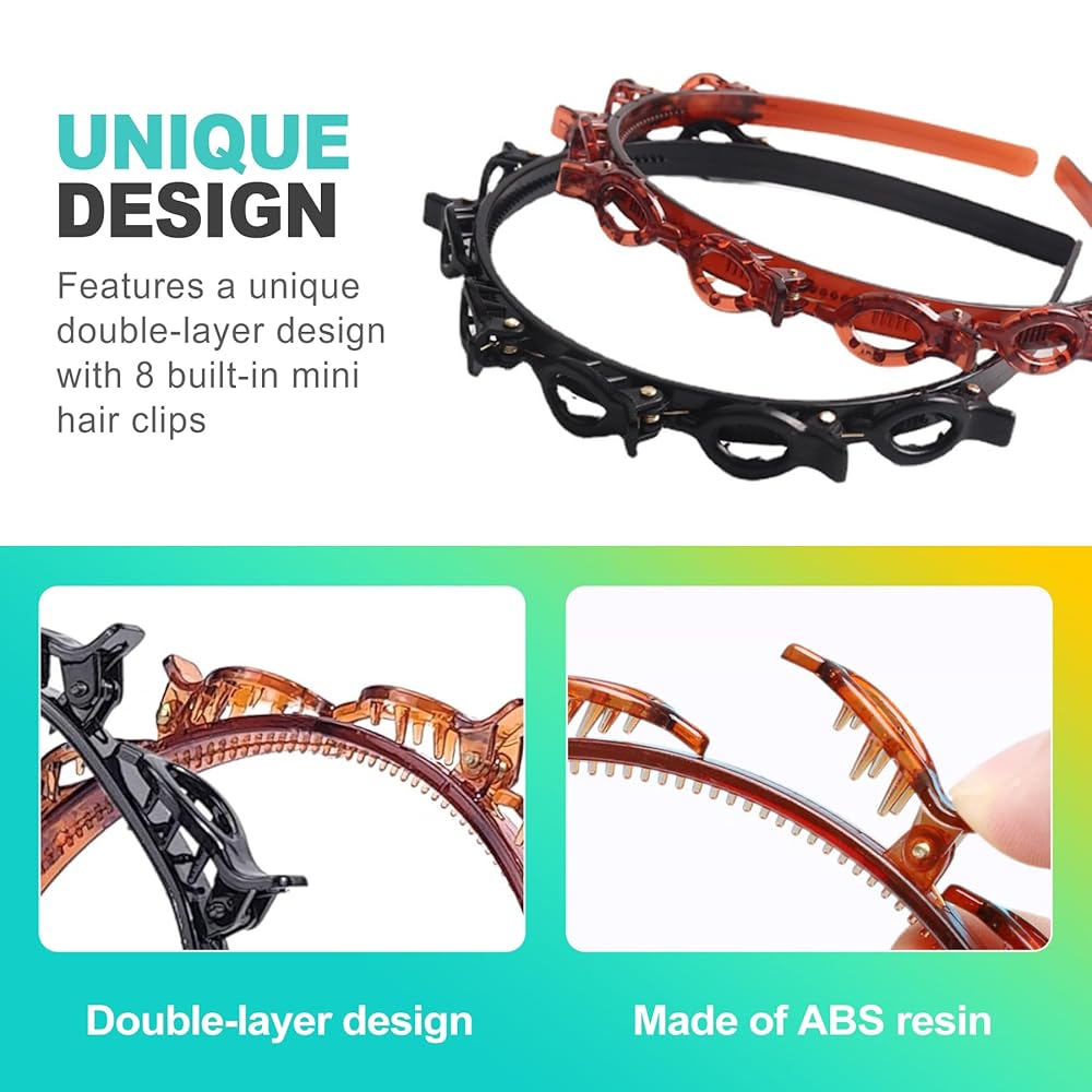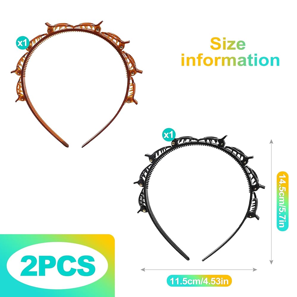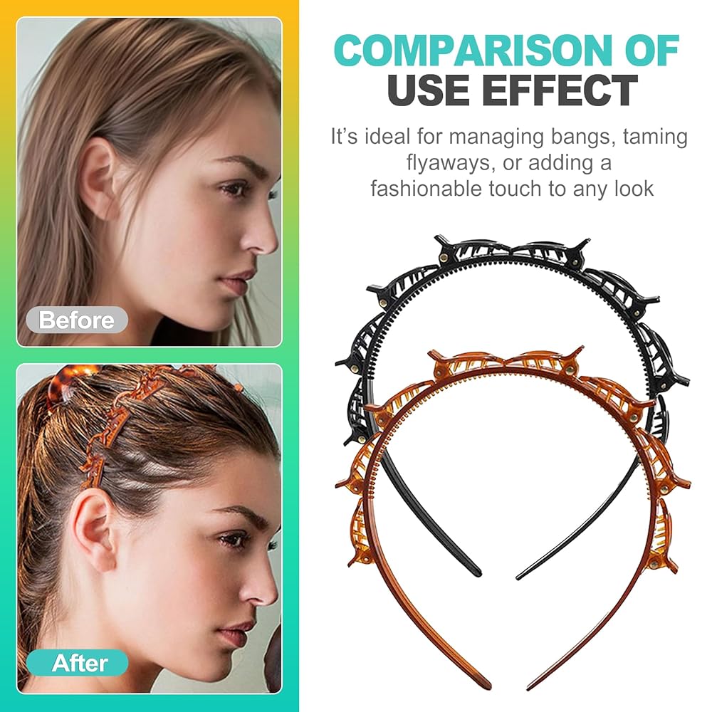 Easy Hair Styling with This Headband Set! Our 2-piece headband set (Black & Brown) features a double-layer design with 8 mini clips. This clip headband allows for braided bangs or layered styles. The lower hair band with clips holds hair securely. Made from flexible, lightweight resin, this hairband provides comfortable grip for all hair types, including short hair. Suitable for any occasion.