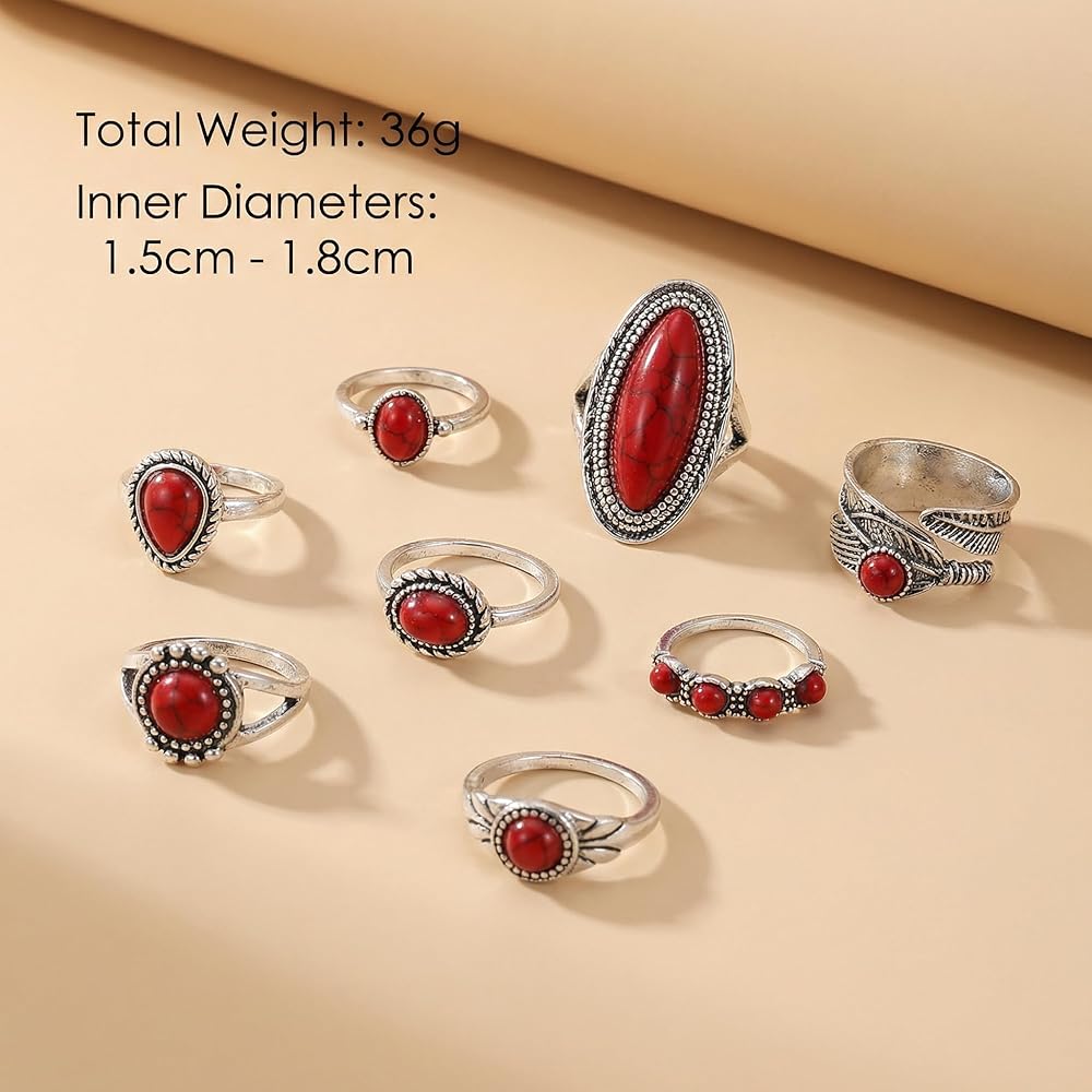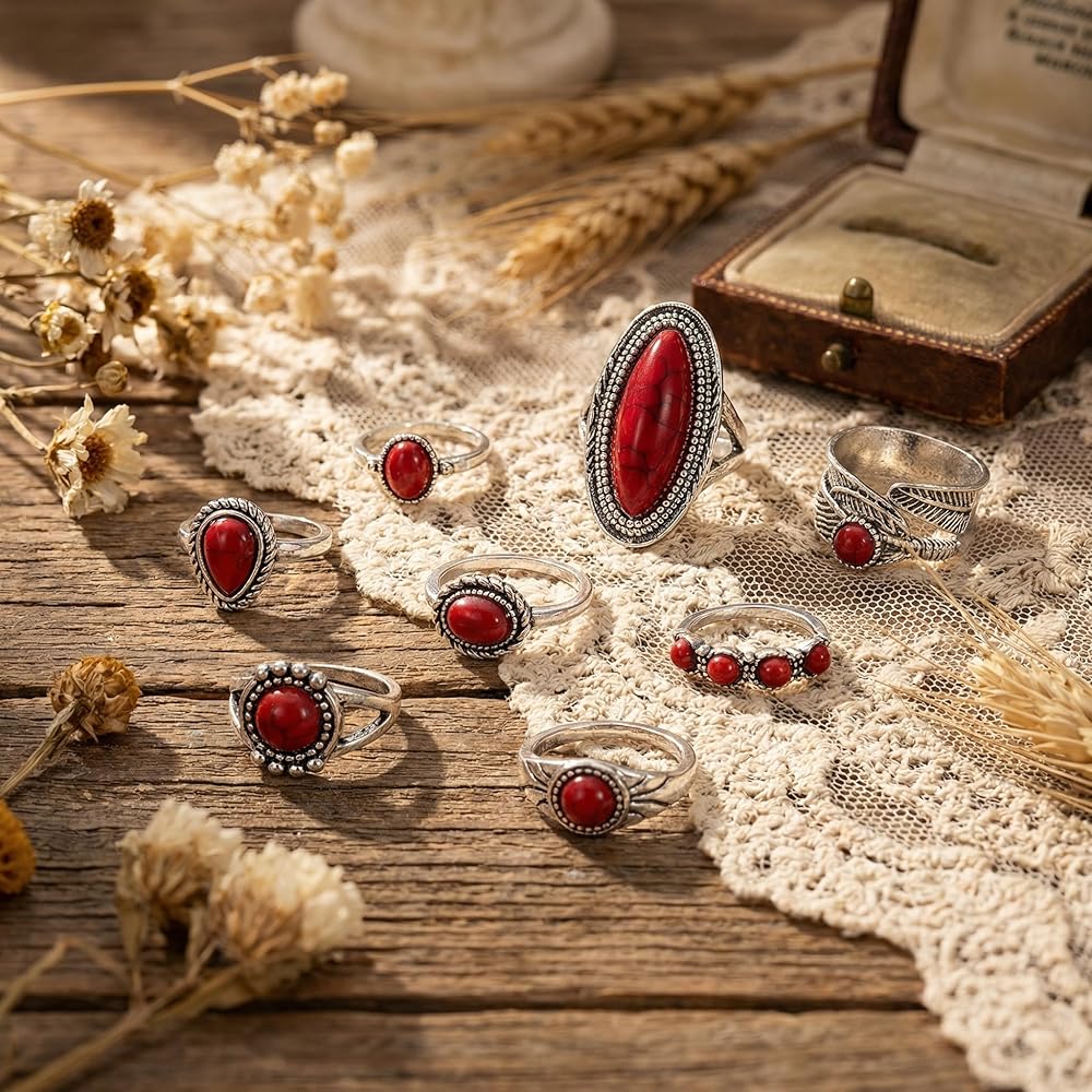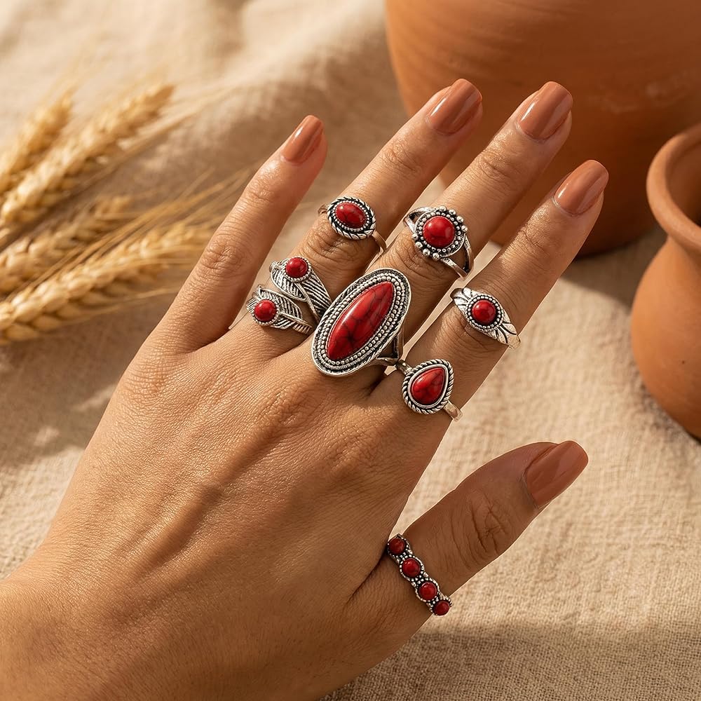 Elevate Your Hand Game with Our Western Red Stone Ring Set Are you ready to embrace the boho-chic trend? Our 8-Piece Western Ring Set is the accessory kit for women who love to express their style.
