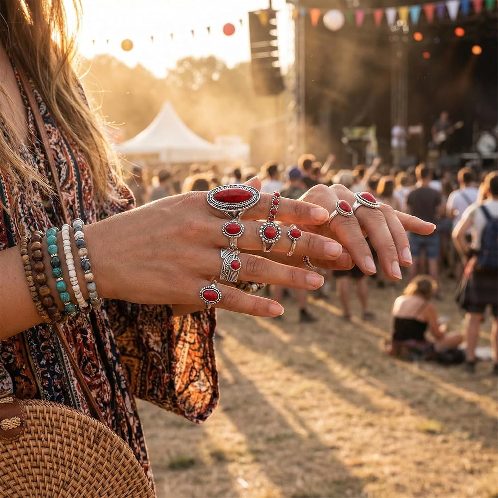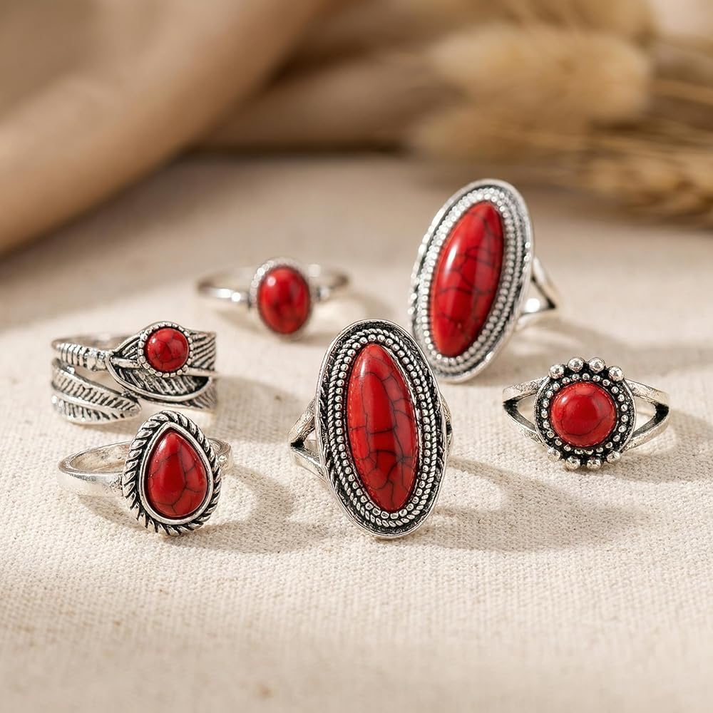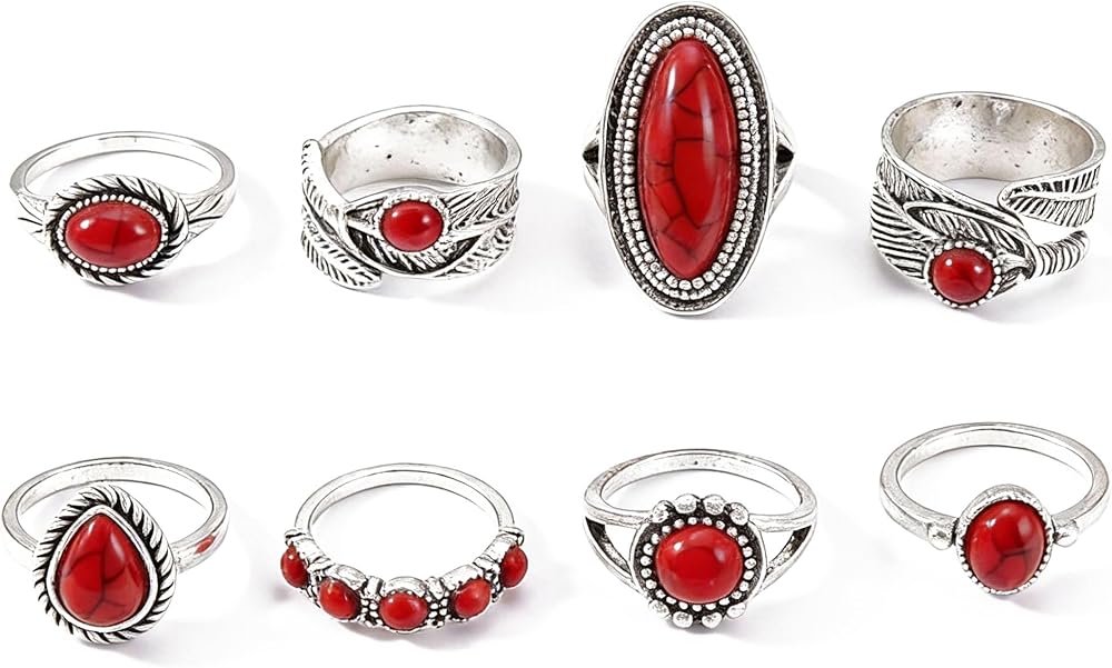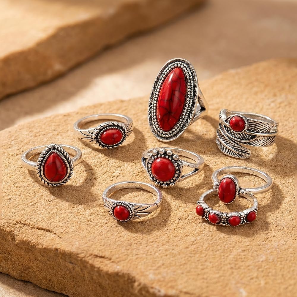 Elevate Your Hand Game with Our Western Red Stone Ring Set Are you ready to embrace the boho-chic trend? Our 8-Piece Western Ring Set is the accessory kit for women who love to express their style.