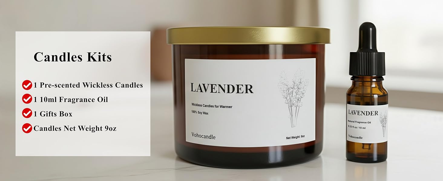[مع زجاجة زيت عطرية واحدة]: شموع بوزن 9oz تأتي مع رائحة اللافندر، بالإضافة إلى زيت روائح متطابقة 10 مل، مما يمنحك رائحة قابلة للتخصيص بناءً على الذوق الشخصي، وكذلك للغرفة الأكبر وتجمعات الأصدقاء وحفلات العطلات العائلية.
