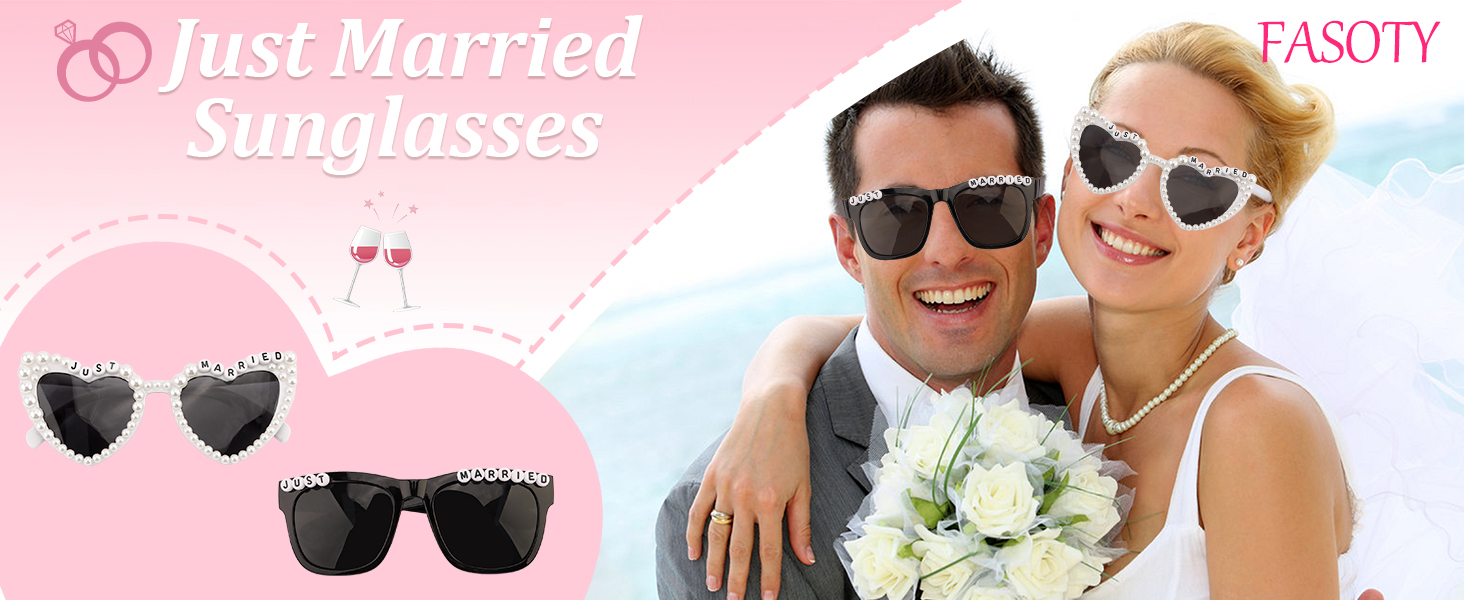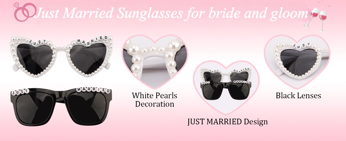 عناصر تصميم فريدة من نوعها "JUST MARRIED": تتميز نظارة العروس الشمسية بإطار أبيض رقيق على شكل قلب مع لمسات من اللؤلؤ، بينما تتميز نظارة العريس الشمسية بإطار مربع أسود جريء منقوش عليه عبارة "JUST MARRIED". هذه التفاصيل تجعلها نظارات زفاف جذابة وديكورات مثالية للمتزوجين للتو للصور أو حفلات الاستقبال أو النزهات غير الرسمية. التصاميم المرحة والأنيقة تجسد بشكل جميل فرحة الزواج