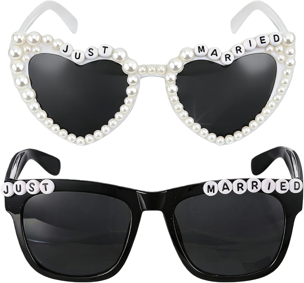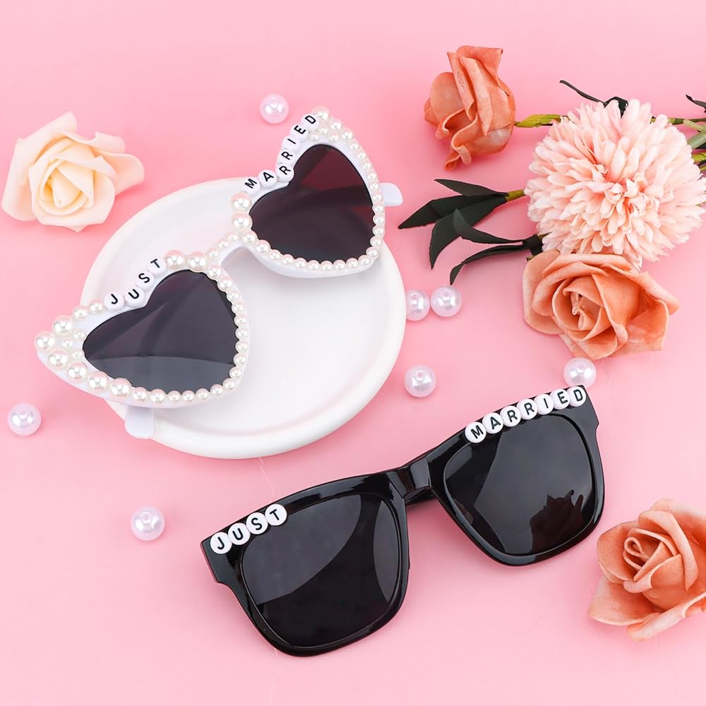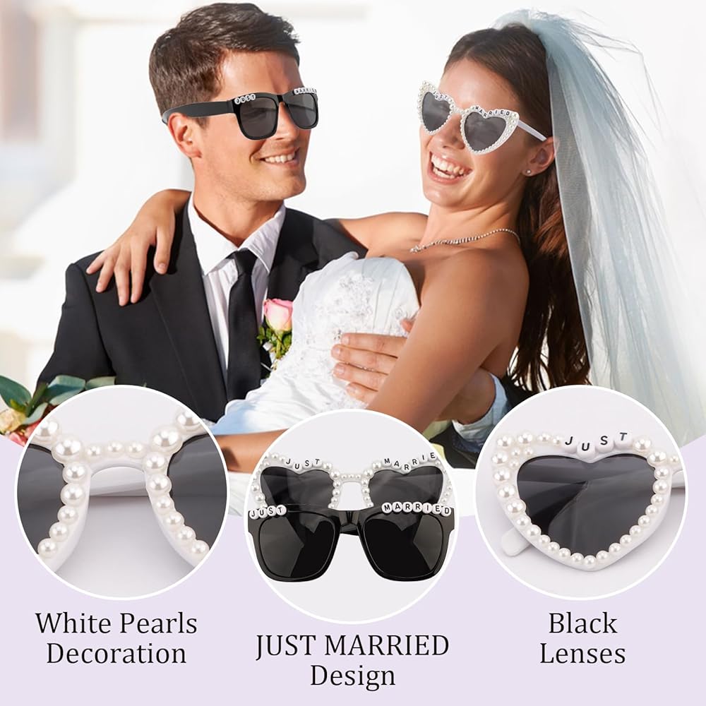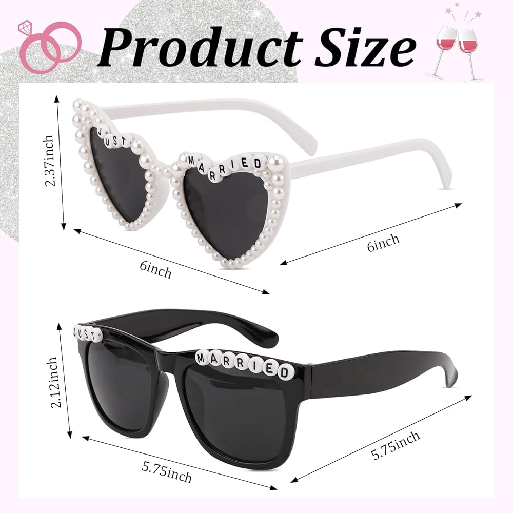 مجموعة نظارات الزفاف للعروس والعريس: نظارة شمسية بيضاء على شكل قلب لؤلؤية للعروس ونظارة شمسية مربعة سوداء أنيقة، وكلاهما مكتوب عليهما عبارة "JUST MARRIED". مثالية للاحتفالات أو الصور أو الزينة، تضمن هذه المجموعة تألق الزوجين بأناقة!