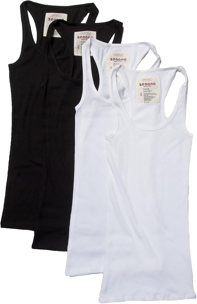 عبوة من 4 قمصان نسائية مضلعة بدون أكمام من Zenana مقاس صغير، أسود، أسود، أبيض، أبيض