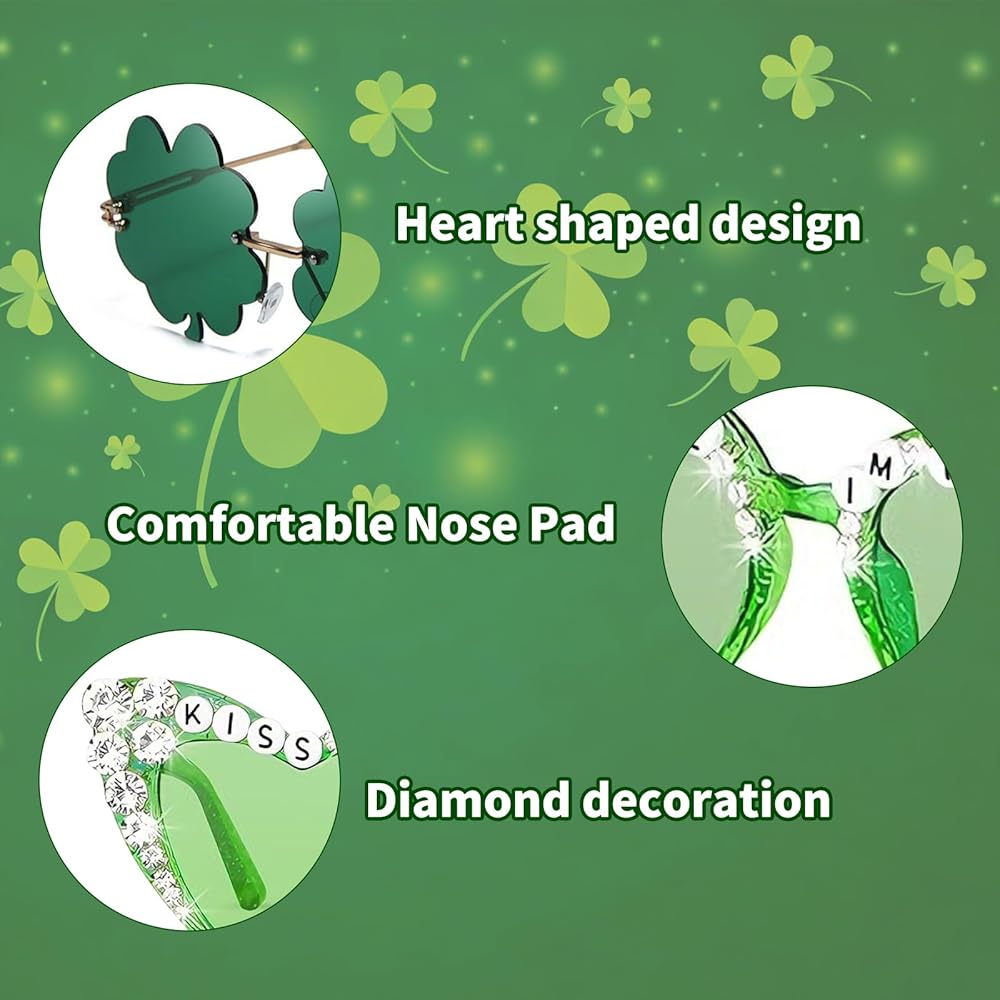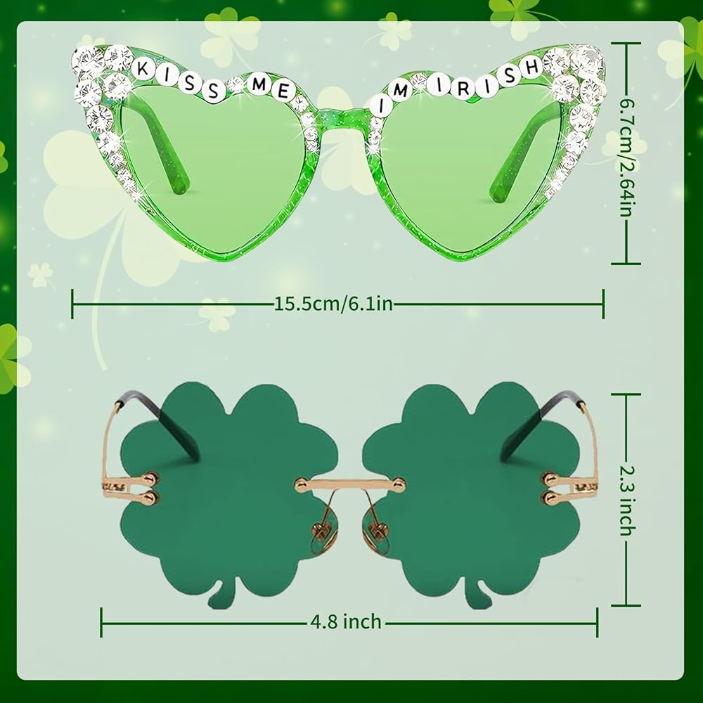 Style St. Patrick's Day Sunglasses Set for Festive Fun:This set includes 2 iconic designs: shamrock-patterned sunglasses (inspired by four-leaf clovers) and heart-shaped “KISS ME I'M IRISH” glasses. Vibrant green hues and playful details make them perfect st patricks day accessories, adding luck and charm to your holiday celebrations or st patricks day decorations.