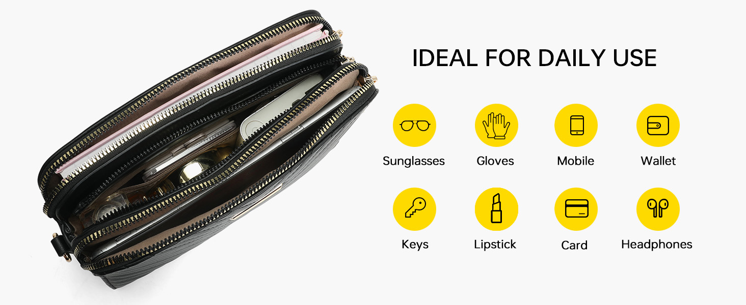أبعاد صغيرة وخفيفة الوزن: يبلغ قياس هذه المحفظة السوداء 8.66 بوصة طولًا × 2.95 بوصة عرضًا × 6.3 بوصة ارتفاعًا وتزن 0.97 رطلًا فقط، وتوفر مساحة واسعة لهاتفك ومحفظتك ومفاتيحك مع ضمان الراحة طوال اليوم دون تعب الكتف.
