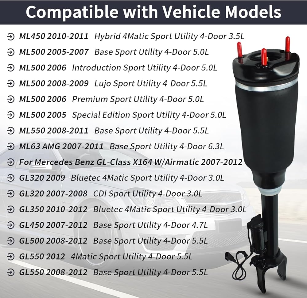 تطبيق السيارة: تم تصميم ممتص الصدمات الهوائي الأمامي الخاص بنا خصيصًا لسيارة Mercedes Benz W164 ML-Class ML320 2007-2009، ML350 2005-2011، ML450 2010-2011، ML500 2005-2009، ML550 2008-2011، ML63 AMG سيارة 2007-2011. دعامة الهواء الأمامية متوافقة مع سيارة مرسيدس بنز X164 GL320 2007-2009، GL350 2010-2012، GL450 2007-2012، GL500 2008-2012، GL550 2008-2012