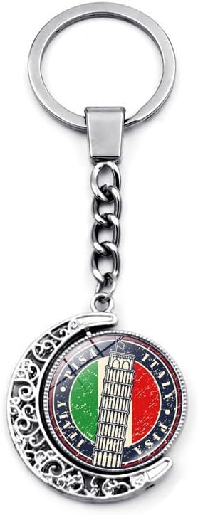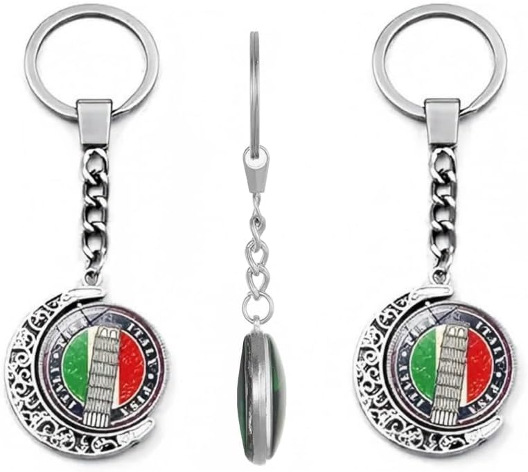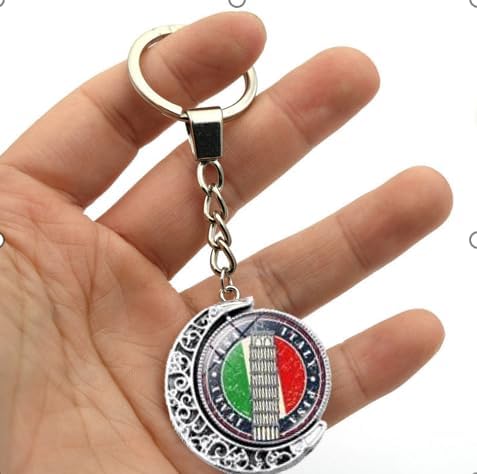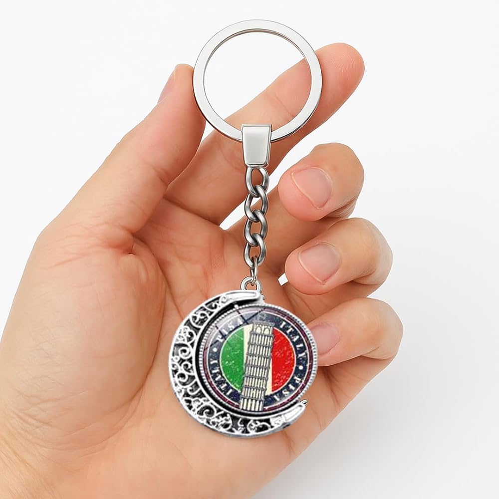 Each keychain features a crystal glass round pendant with vibrant Italian flag colors and detailed landmark artwork, surrounded by a zinc alloy hollow crescent frame that adds a unique vintage-style finish.