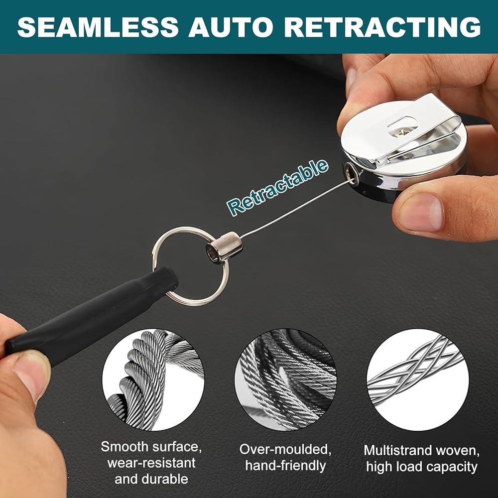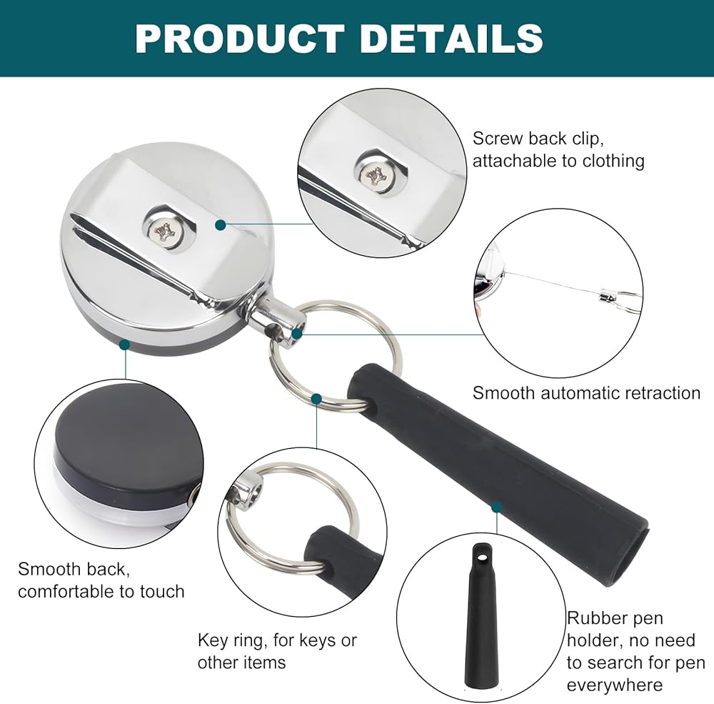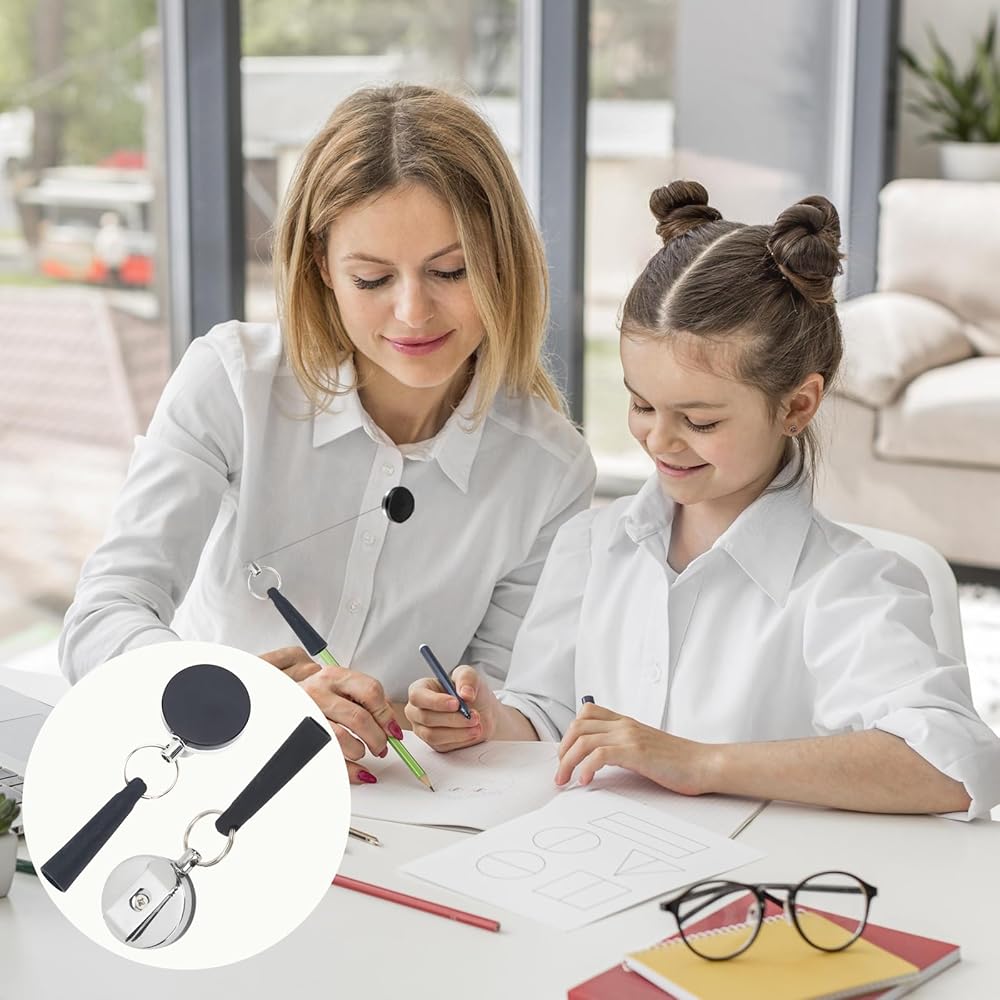 • Key features include retractable steel wire (stretches for easy pen use, retracts to prevent tangling), dual functionality (pen holder + key ring), and anti-loss design (keeps pens/keys attached to your person). The wire retracts smoothly with a gentle pull, and the key ring attachment lets you bundle small items (like USB drives) with your pen. As retractable pencil holder, it works for left and right-handed users without hindering writing.​