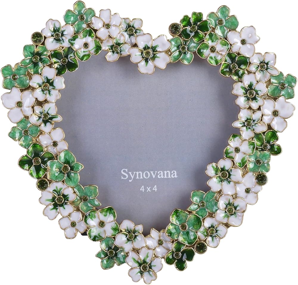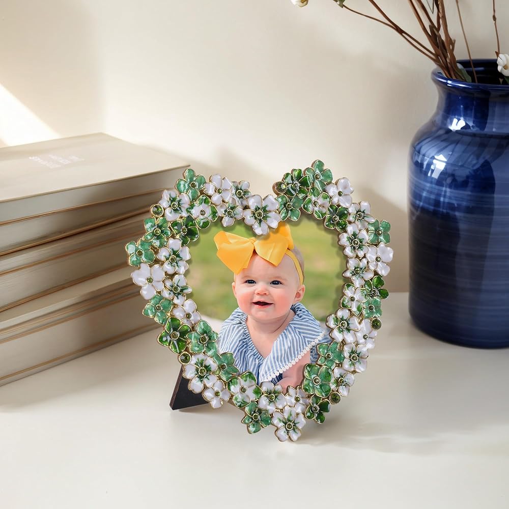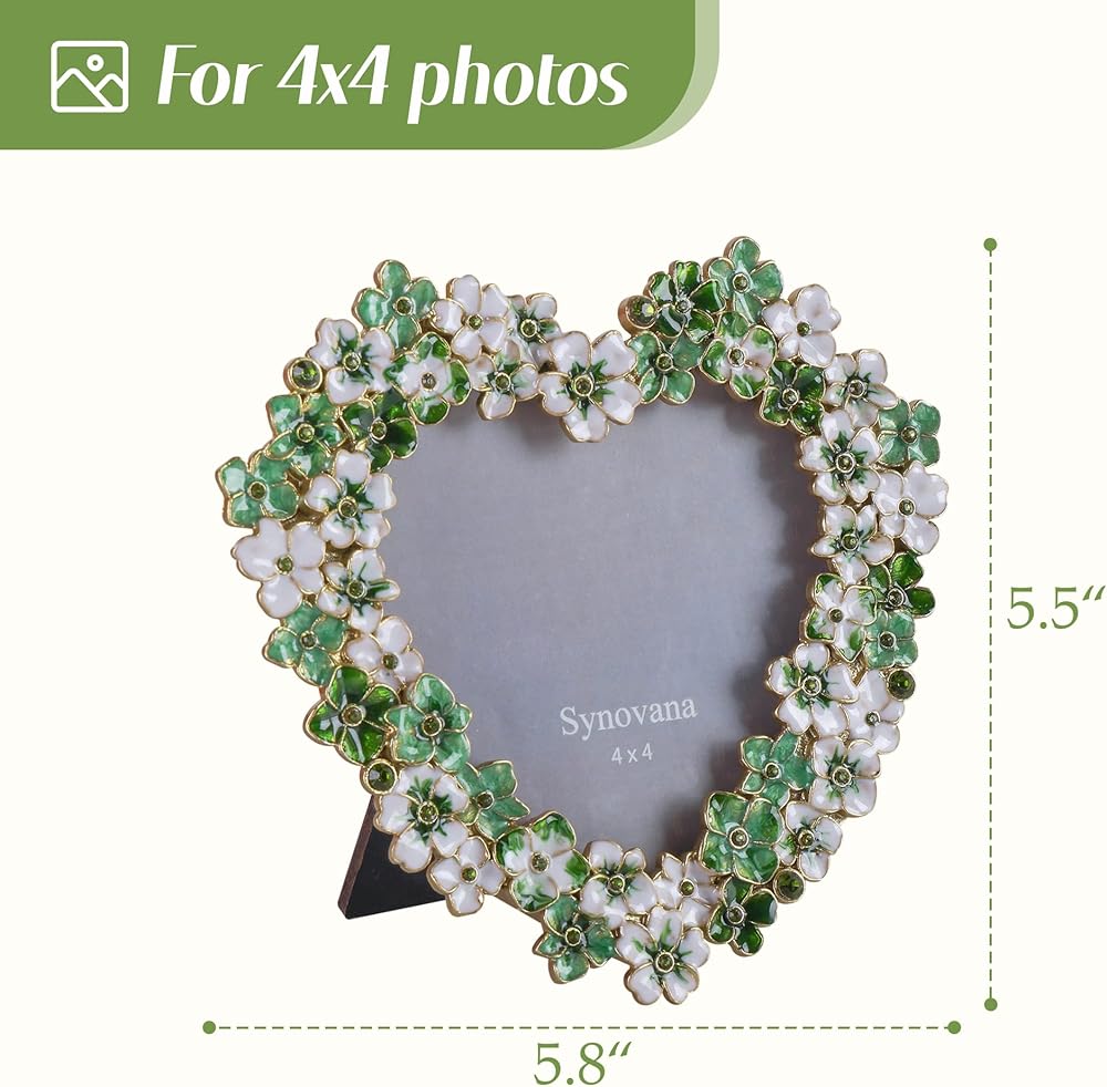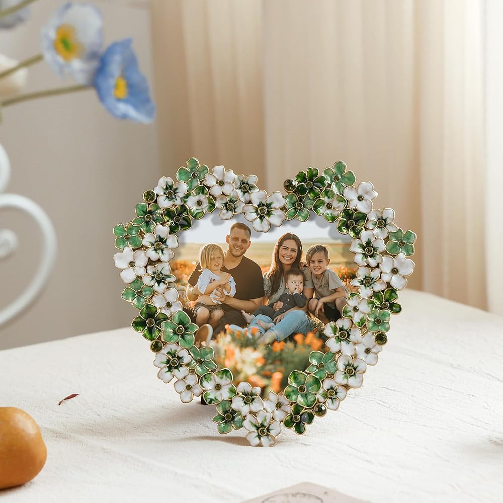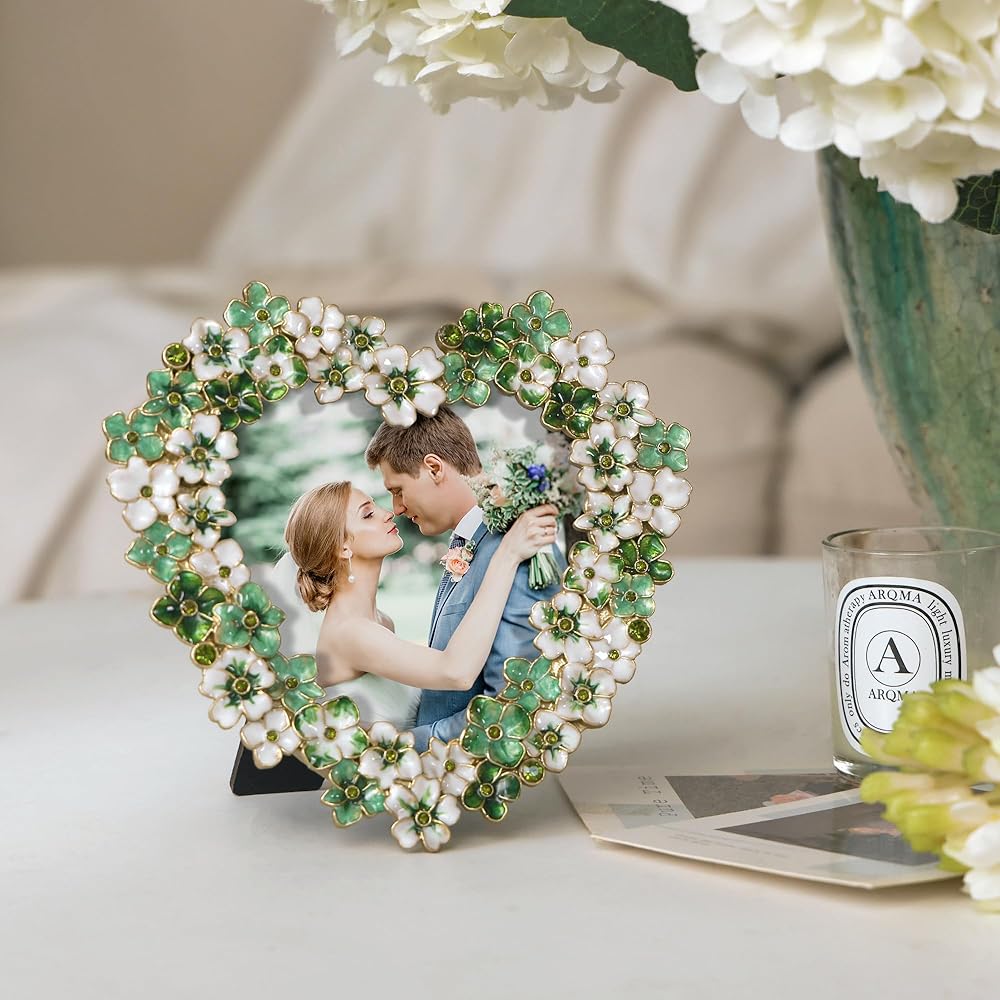 إطار صورة زهور خضراء - إطار صور على شكل قلب مقاس 4 × 4 للذكرى السنوية، هدية عرض على الطاولة