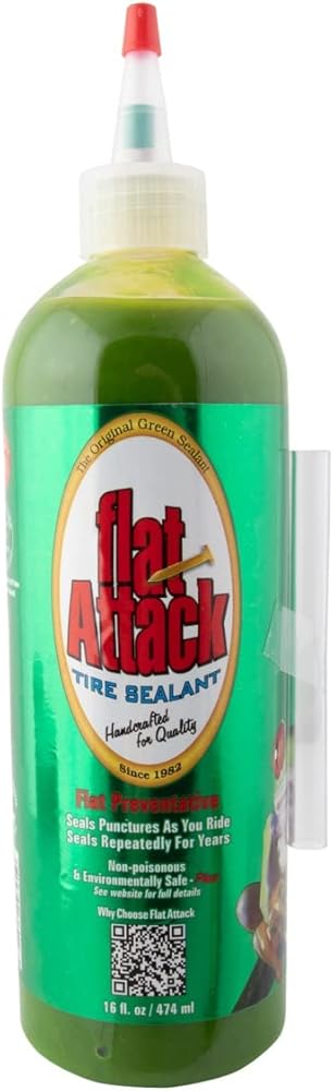 Boost your cycling performance with the Flat Attack Tire Sealer 16oz Tube - the ultimate solution for quick, reliable flat repairs on bicycle tubes. Specifically engineered for cyclists who demand durability and efficiency, this sealant ensures your rides are smooth and puncture-free across various terrains. Materials & Composition Made from environmentally safe, non-toxic, and pet-safe ingredients, Flat Attack Tire Sealer prioritizes rider safety and environmental responsibility. Its advanced latex-based formula is formulated to provide long-lasting adhesion and effective sealing without leaving oily residues inside your tubes. Performance & Engineering Designed for maximum reliability, this 16oz tube delivers rapid puncture sealing, preventing unexpected flats during critical rides. Its innovative formulation prevents the sealant from balling up or drying out, maintaining optimal consistency and performance season after season. The product is highly effective against small to medium punctures, ensuring minimal downtime on the trail or road. Components & Technology Flat Attack Tire Sealer features a state-of-the-art, pre-mixed formula that requires no premixing before use-saving you time and effort. Its unique technology eliminates common installation issues such as plugged valves and pumps, streamlining your flat repair process. With this sealant, even larger holes can be patched later if they exceed sealing capacity, without interference from chemical build-up or residue. Style & Use Case Perfect for use with bicycle tubes in mountain biking, road cycling, commuting, and touring, Flat Attack Tire Sealer is ideal for riders seeking a hassle-free, maintenance-friendly puncture solution. It's recommended exclusively for tube-type wheels and compatible with true UST applications when used in UST-rated tires. Note that it is not suitable for tubeless conversions or non-UST tires. Innovative & Differentiating Features - No premixing needed-never separates