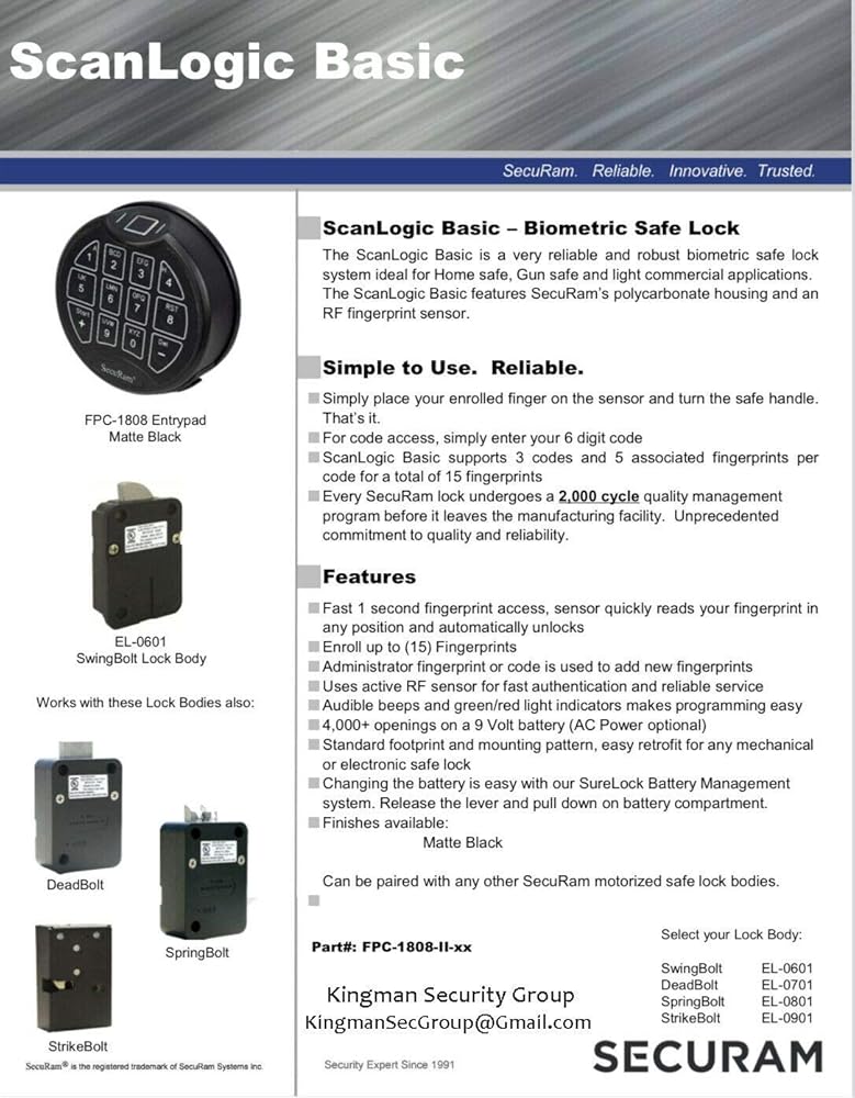 Patented OneTouchTM Auto Fingerprint Verification. Unique self learning function ensures easy operation with reduced False Rejection Rate. Battery saving design with one 9V battery operation and low battery alert. UL approved heavy duty EL-0601 Electronic Swing Bolt Actuator Programmable 0~99 minutes time delay and 0~20 minutes time window. Wrong password entry lock-out penalty. Brass and Satin Chrome Keypad Finish