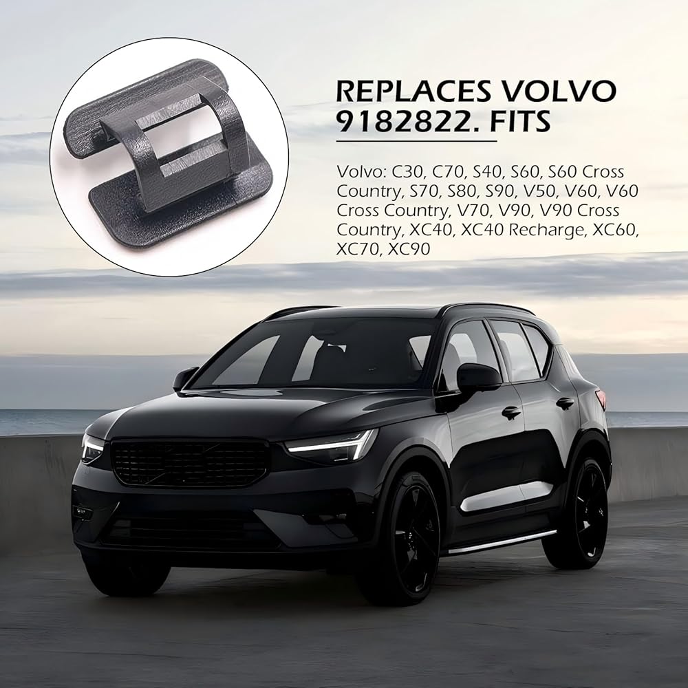 This automotive hood insulation retainer clip is compatible with Volvo C30, C70, S40, S60, S60 Cross Country, S70, S80, S90, V50, V60, V60 Cross Country, V70, V90, V90 Cross Country, XC40, XC60, XC70, XC90. XC70, XC90, Replacement OEM part number 9182822.