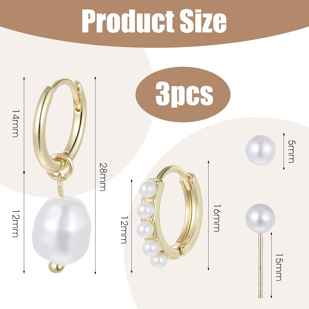 Product size: Pearl Stud: Pearl 5mm (15mm with earring post); Pearl Hoop Earrings: 16mm (pearl portion 12mm); Pearl Dangle Earrings: 14mm (pearl 12mm) – Pearl + Hoop 28mm